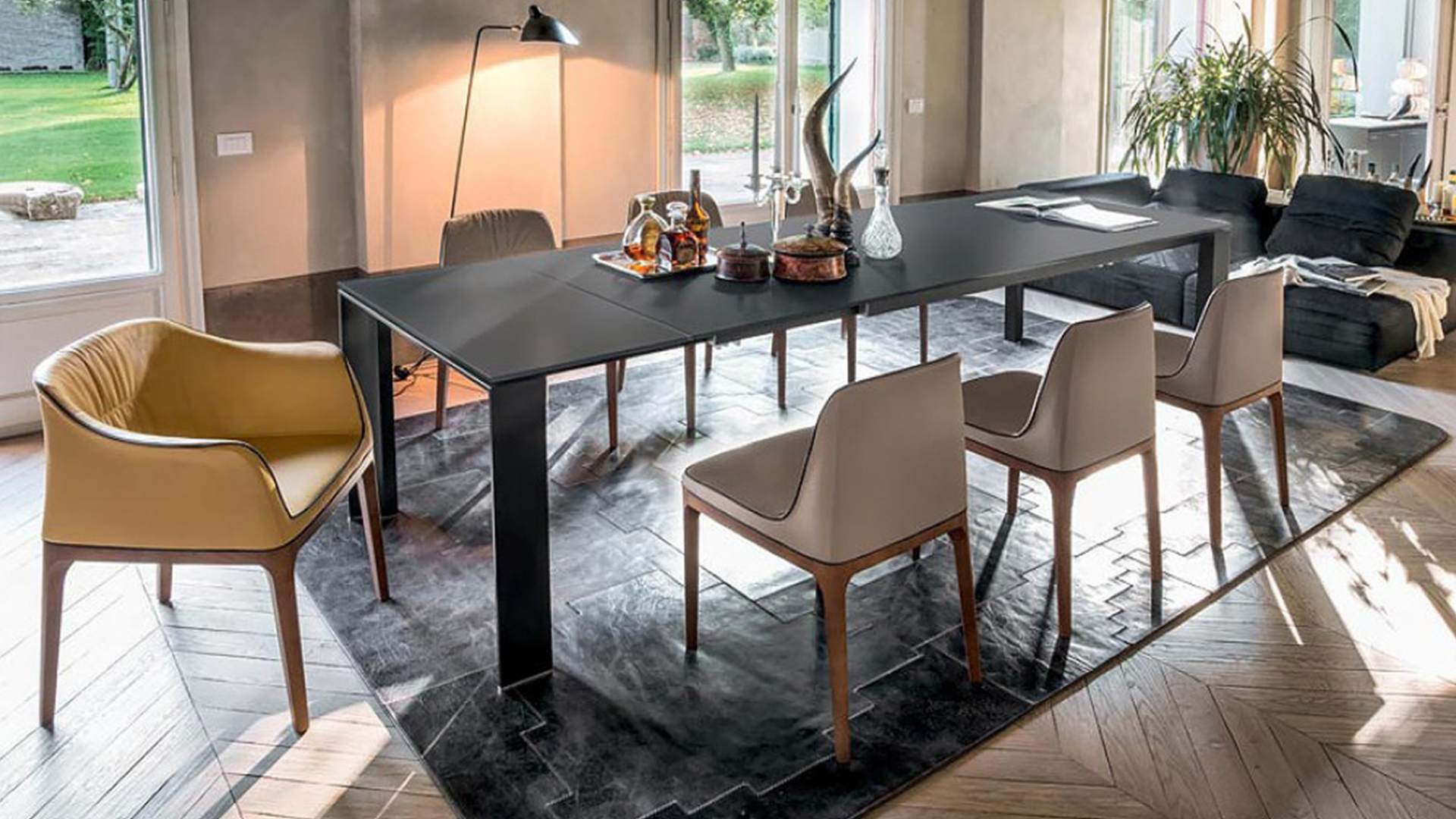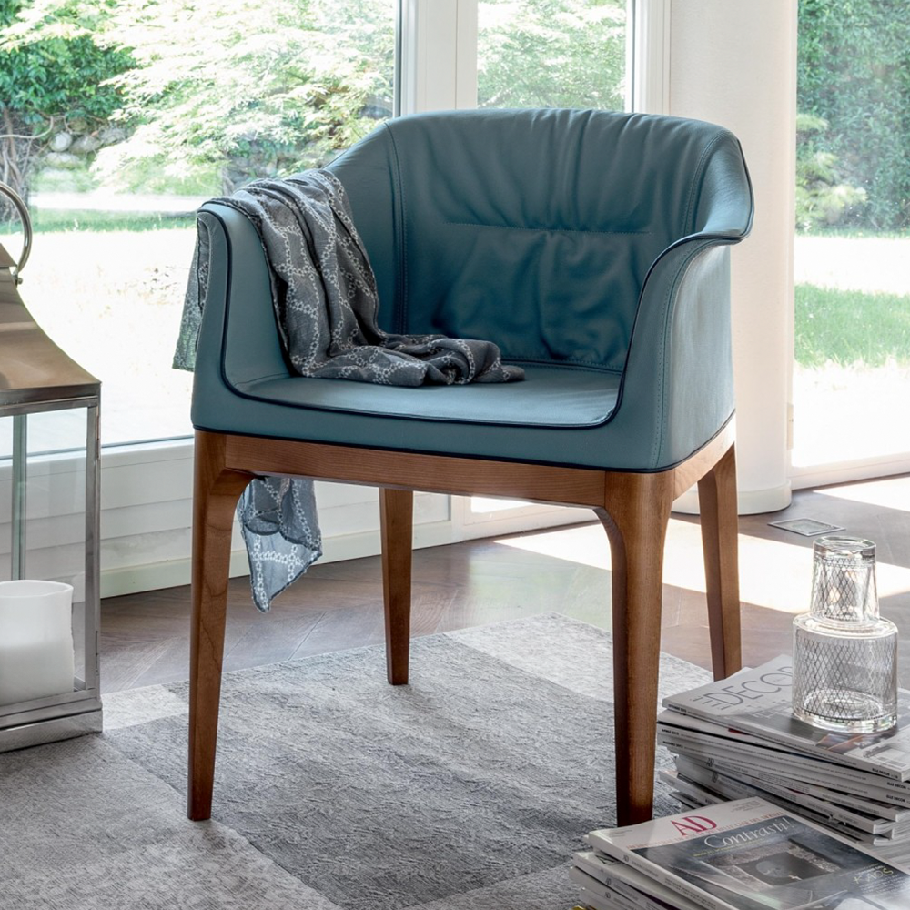 Cold polyurethane foam was injected into this chair’s structure, and that makes it exceptionally comfortable. Angelo Tomaiuolo’s design is refined and elegant, both in the arm-free, and in the regular version. The leather, eco-leather, grain leather, or Nubuk leather upholstery are completed by the precious creasing.