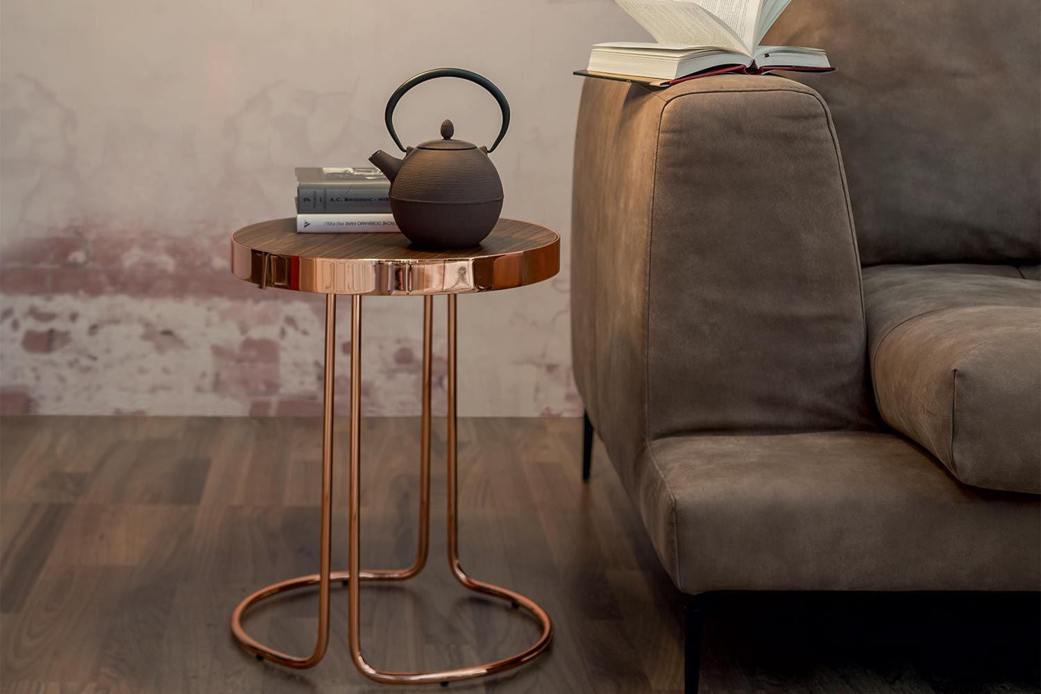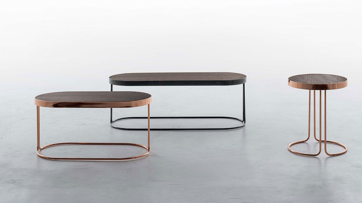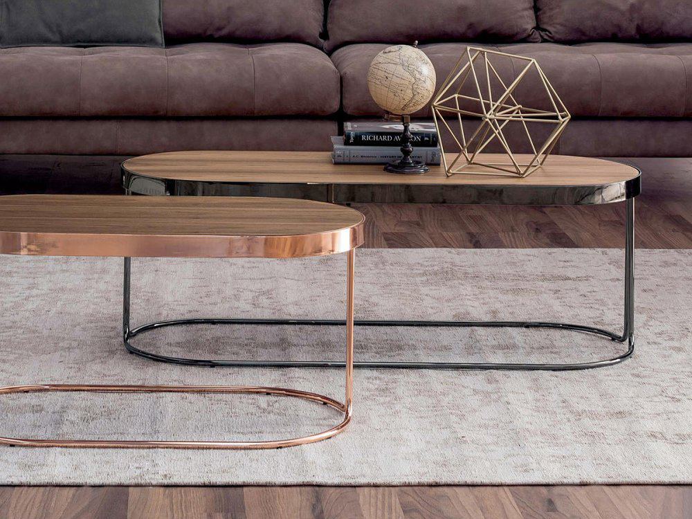 One unique design, for a smaller than a coffee table piece; a slim and tapered, bronzed or coppered chrome structure; a classic top, covered in Canaletto walnut, or heat-treated oak: Cora.