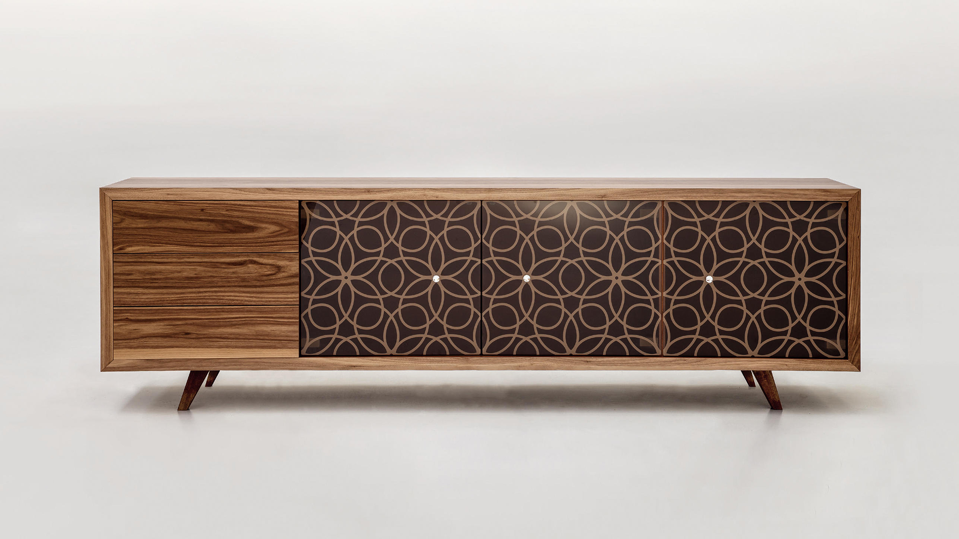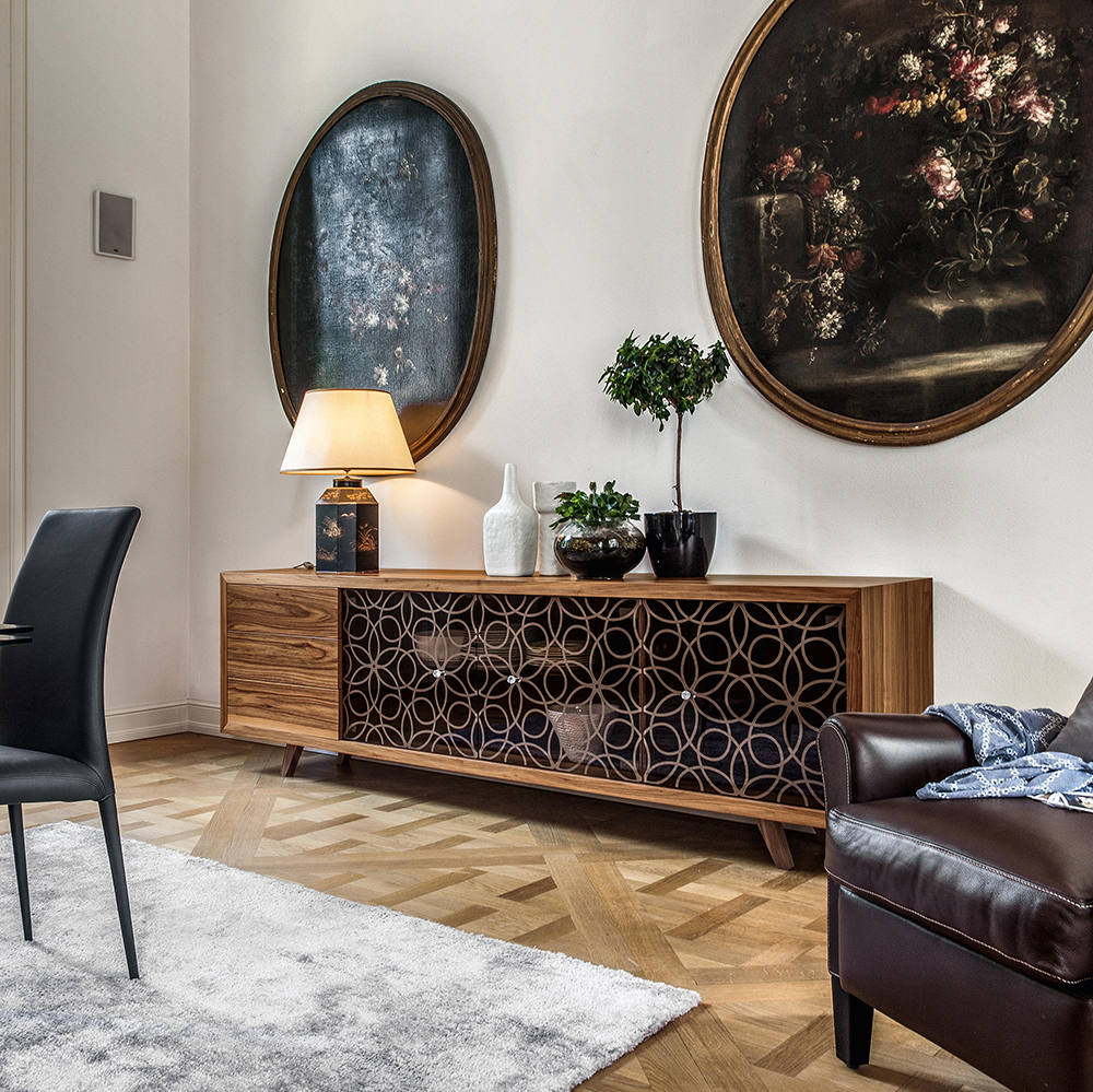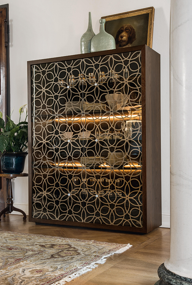 Baroque patterns get inserted onto rectangular doors, both delicate and precise. Luxury is displayed here in its purest form, an intertwining of glass and wood, decored, enrichened, made priceless by the magnificent Swarovski doorknobs.