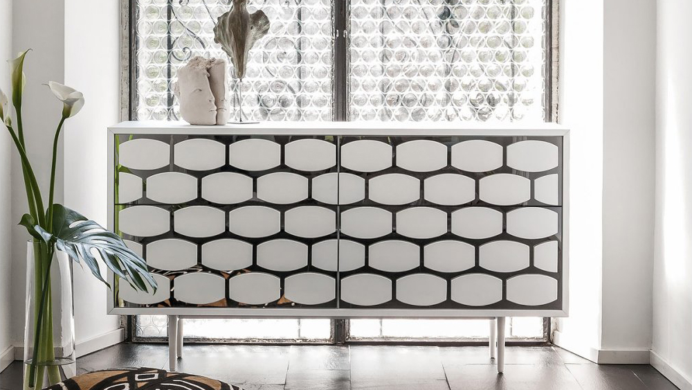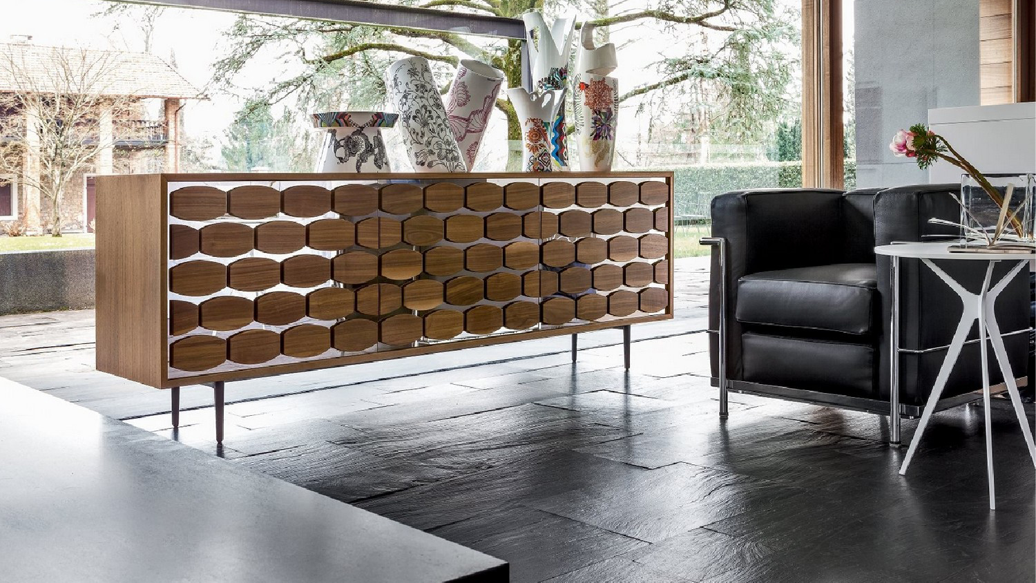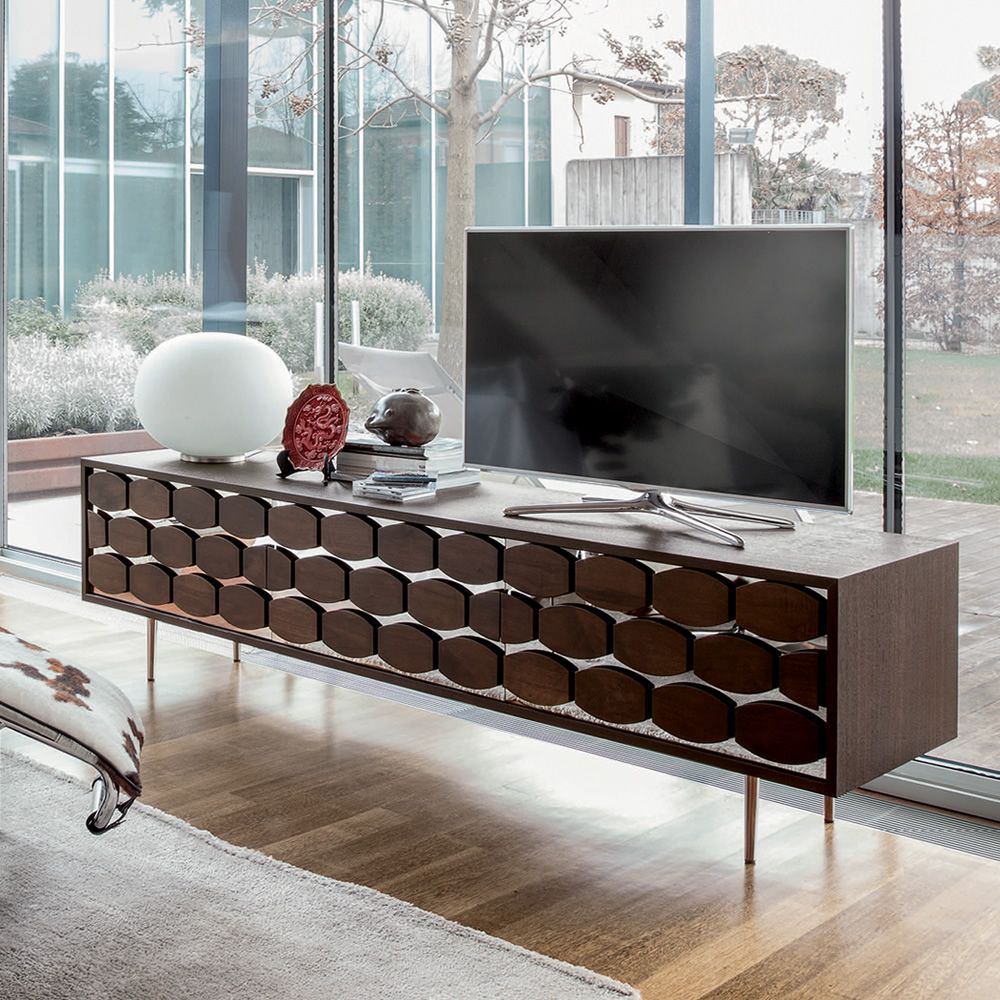 A system for your living-room, where spaces and lines have a fundamental role. Honey TV stands and sideboards, stand out for their distinguished woodworking - Canaletto walnut and heat-treated dark oak, and the accurate choice of glass.