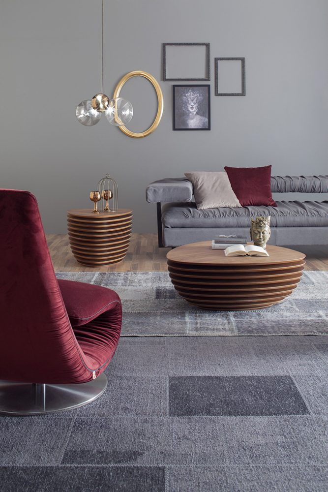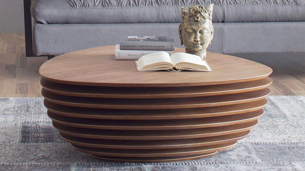 A coffee table, or a side-table, whose wooden tops capture your attention, as if they were moving.