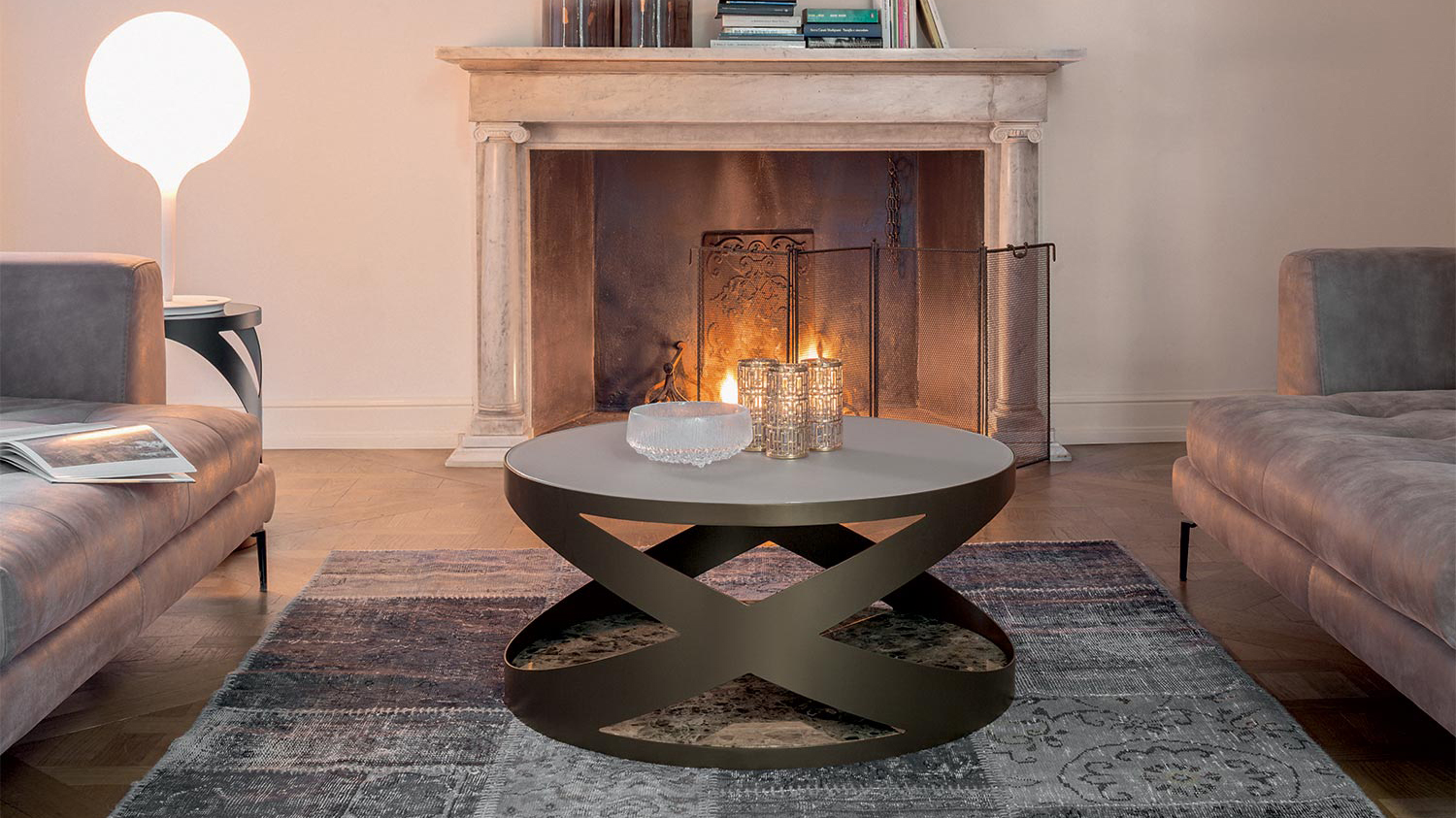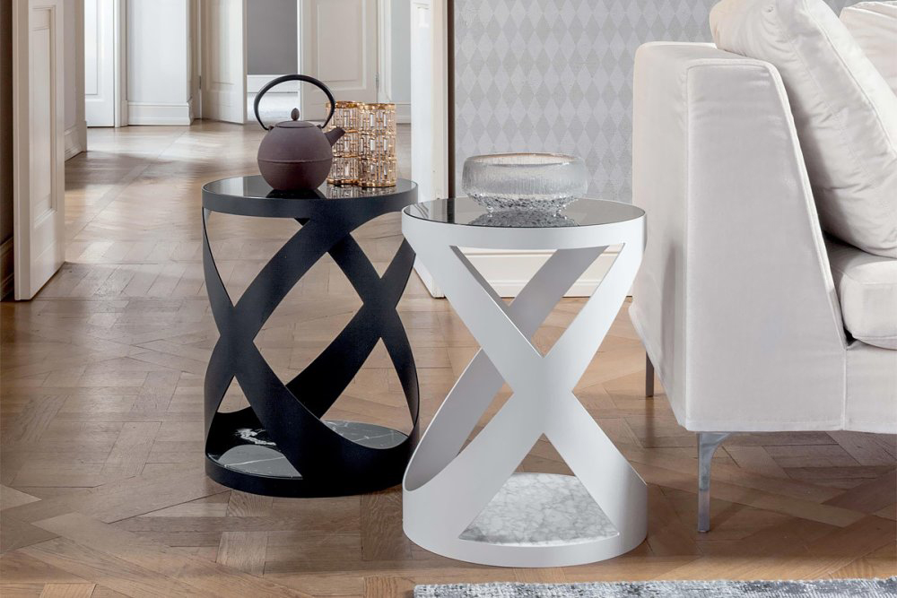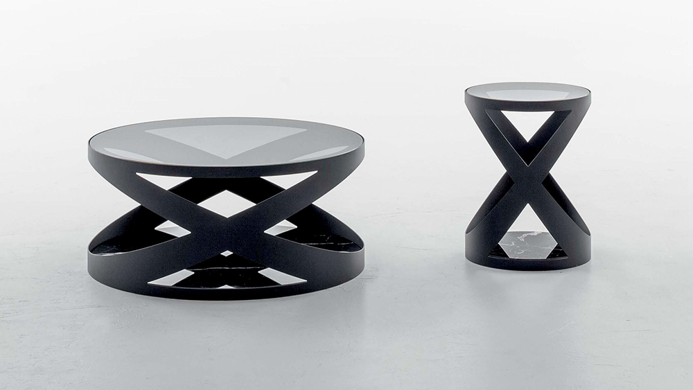 A coffee table and a side table, capable of moving and amaze just like a dining table: Rimini stands out everywhere, thanks to its metal structure’s peculiar design, to its base’s Italian marble richness, and to the varnished and acid-etched glass top. Three different materials on just one object offer you a huge range of combinations: white, black or bronze metal; white Carrara, black Marquinio, Emperador bronze marbles; transparent grey, black, white and beige acid-etched glass.