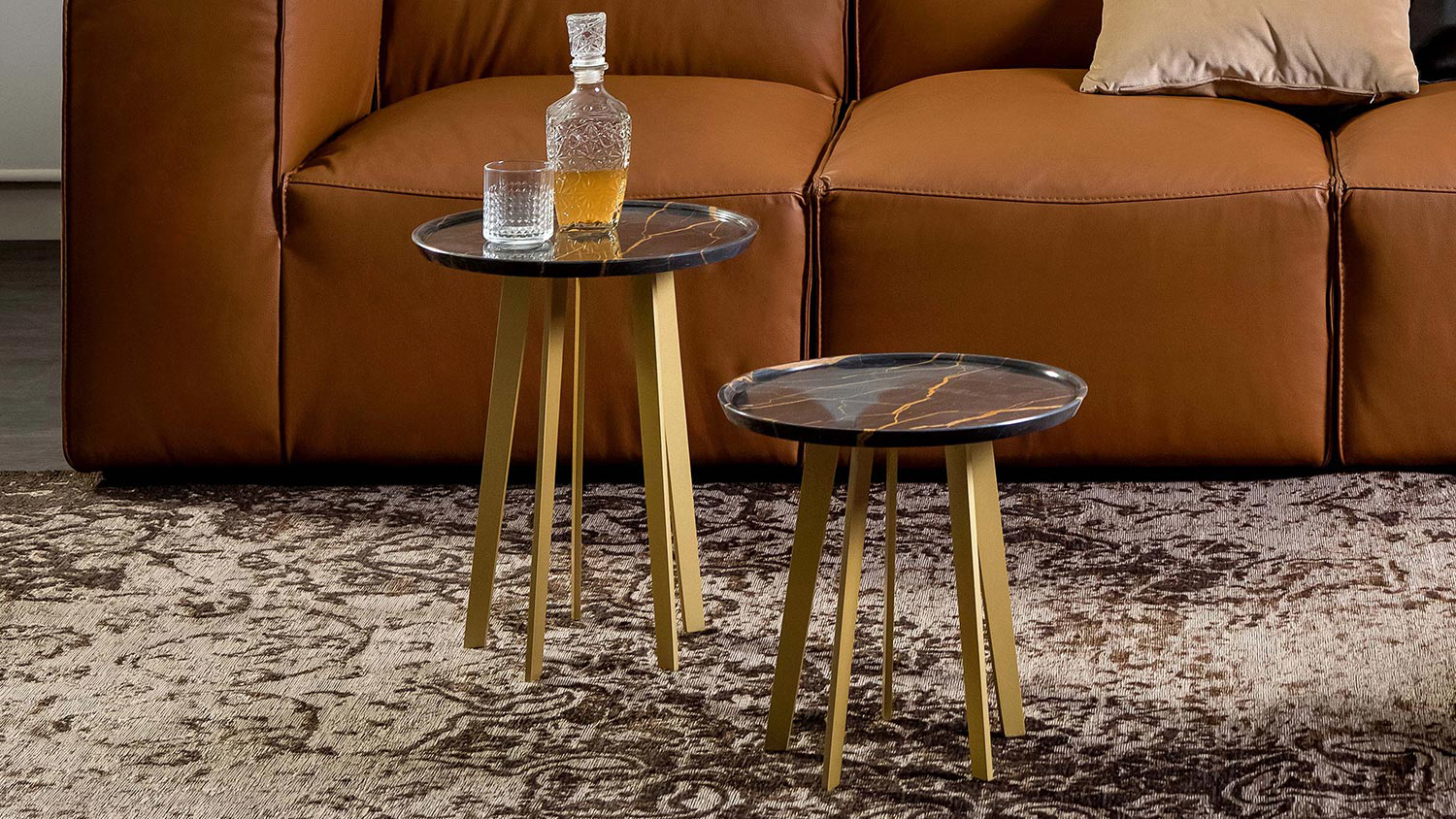 Composition of side table and coffee table made with the most precious marbles, that create hollows tops as if they were trays, and with matt gold lacquered base.