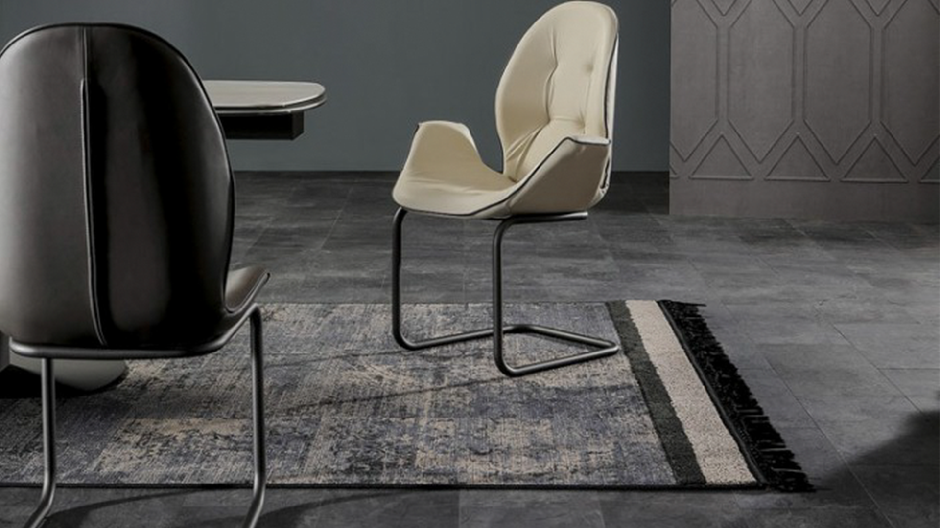 Sorrento peculiar shape, soft curves created by the padded seat, leather or eco-leather covering and its refined creasing are coming back by posing onto a light and thin base. Curved varnished metal legs bend to form a single base, a sledge to support an unforgettable seat.