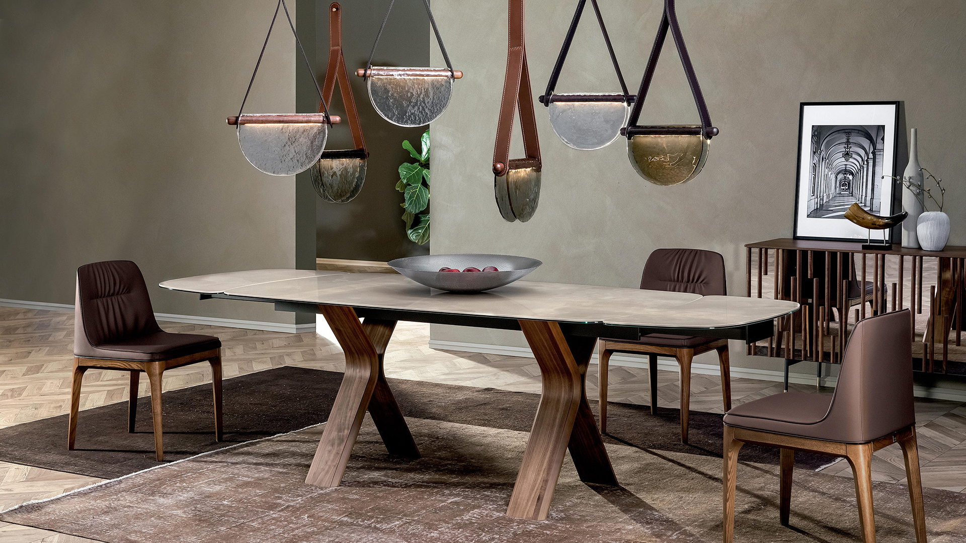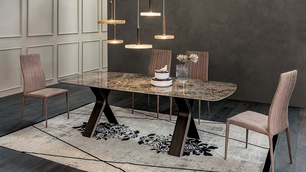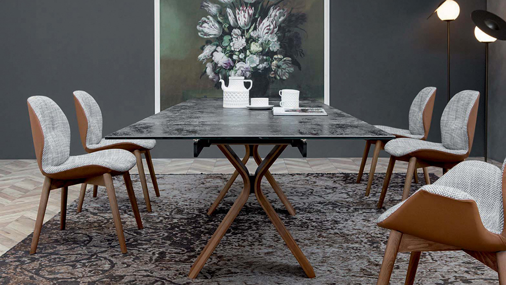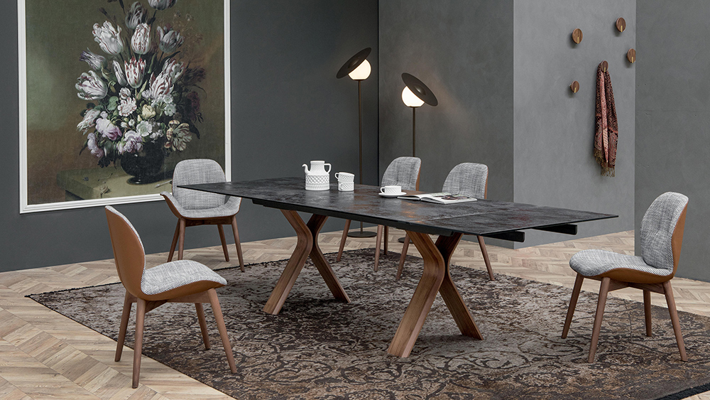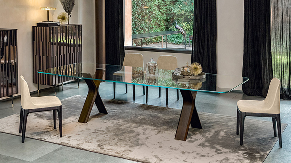Fixed or extendible table with thermocurved wood base, designed to be combined with elegant glass or porcelain stoneware tops. the simplest lines can be the most elegant and the most timeless one.