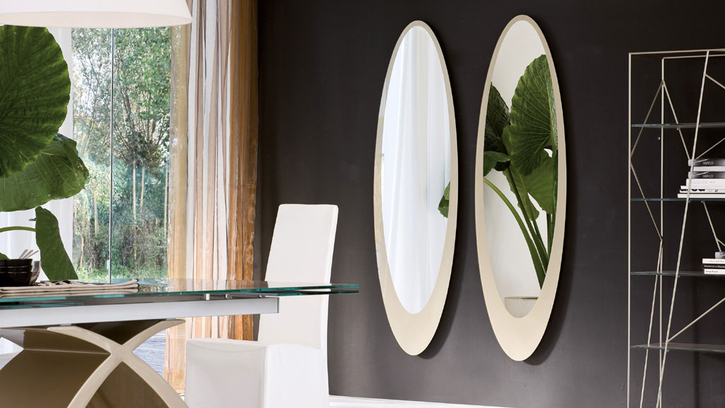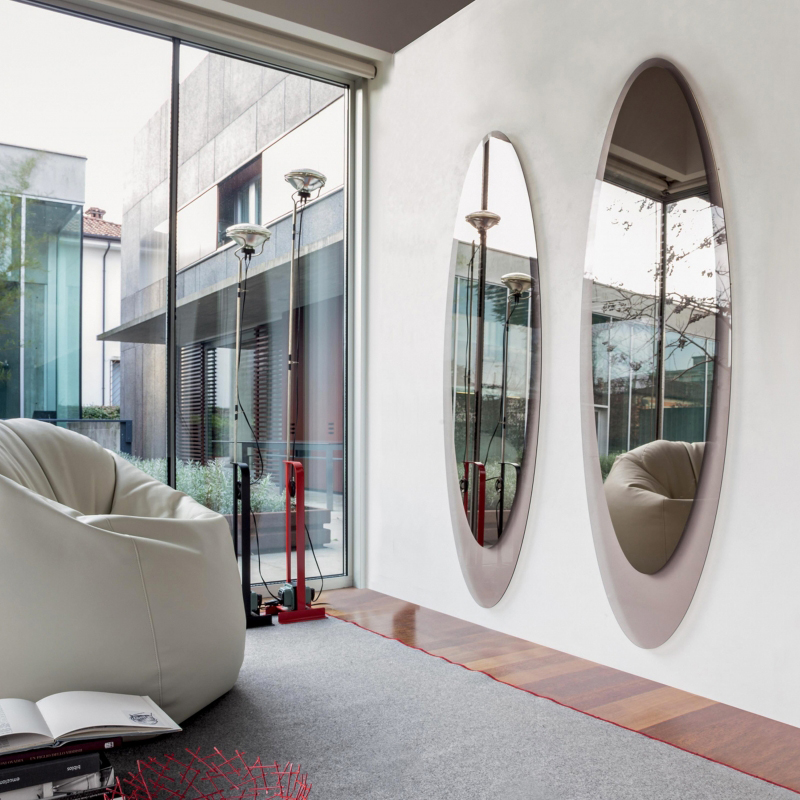 Olmi mirror reminds of a double ellipsis, slightly stretched at the bottom, one coming out of the other. The first one - the base with serigraphy - leaves room to the actual mirror.