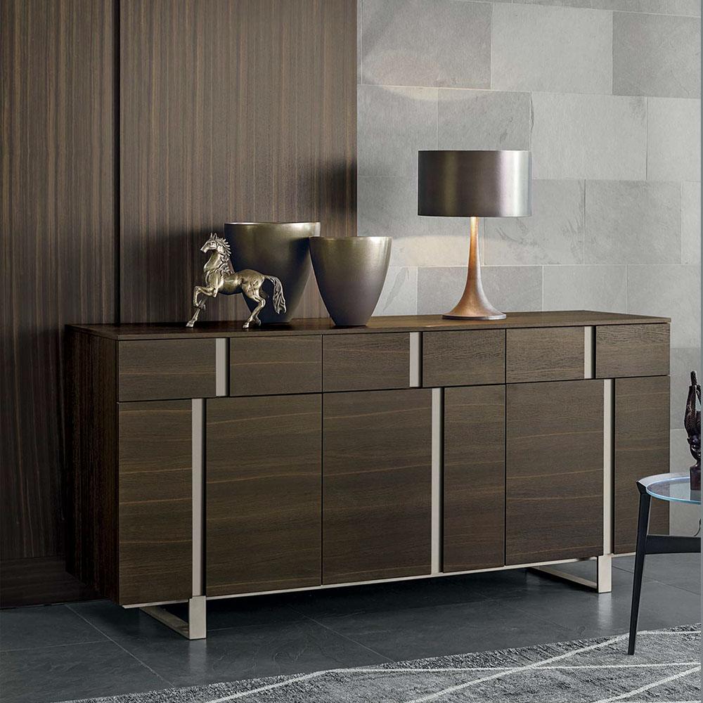 3-door Athena sideboard with a textured eastern ash carcass, matt anthracite 160 lacquered inserts and anthracite 160 metal base.