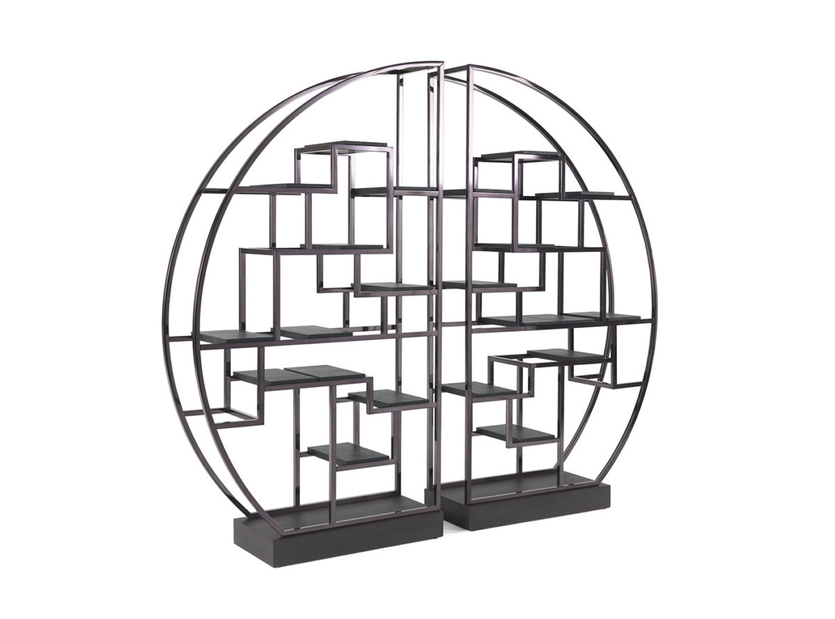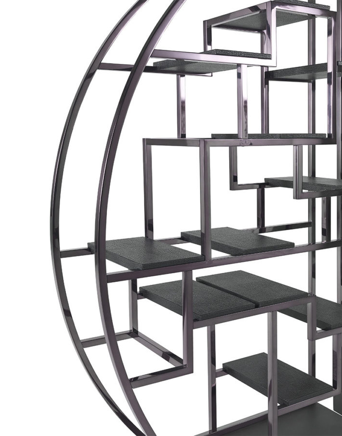 A new chrome-plated London smoke grey for the Psyco bookcase, presented for the first time at the Salone del Mobile 2018. The original oriental inspiration that can be found in the round shape is thus enhanced by a metropolitan note giving life to a spectacular element of furniture with a contemporary and refined allure.