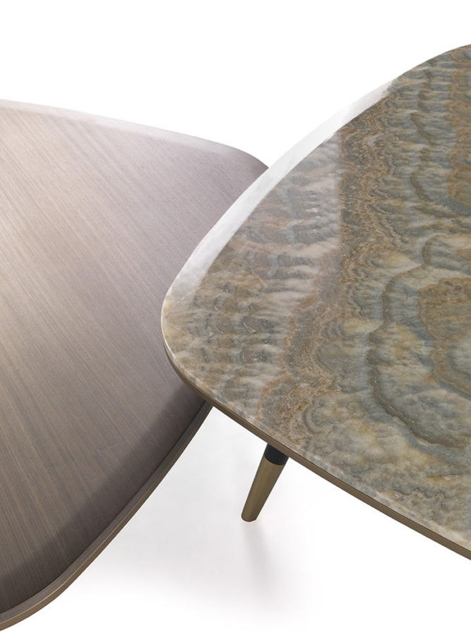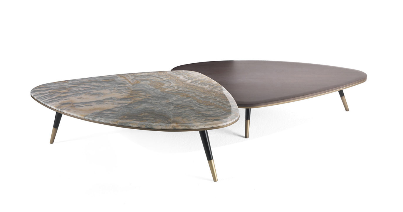 Inspired by the 50s and characterized by oblique legs, brass caps and profiles, curved top with an irregular shape, Camberwell tables allow you to create unique compositions thanks to the different heights and materials available for the top, such as marble or tay wood tinted smoky grey.