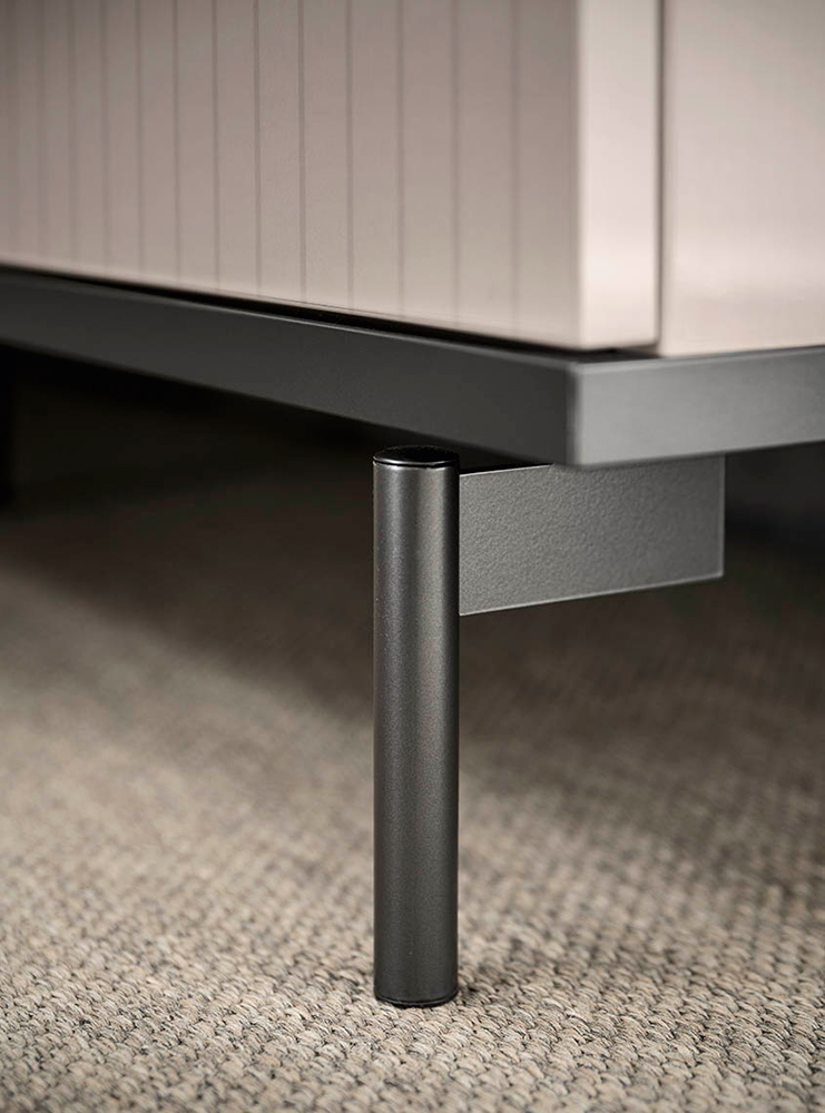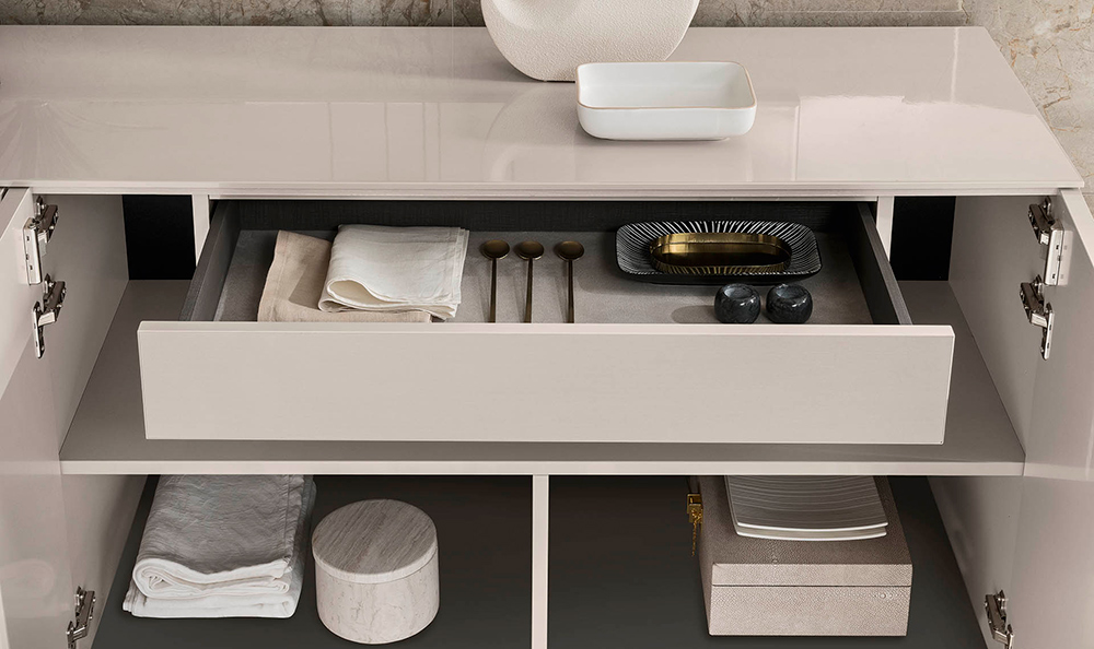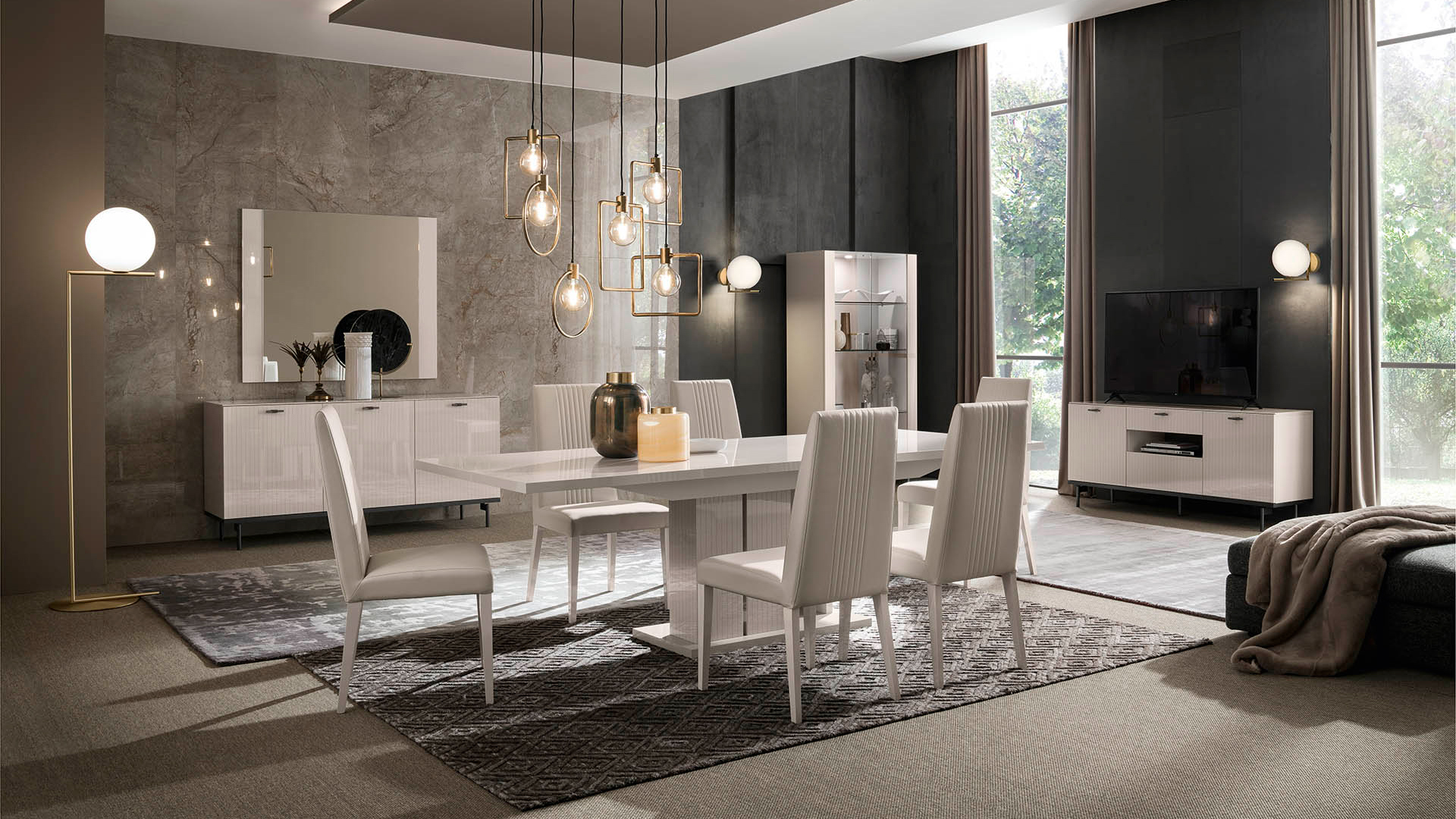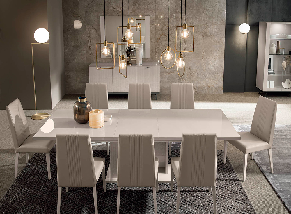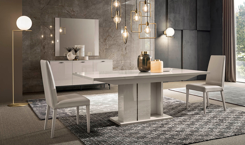 This set features bold Pearl Eco Veneer High Gloss and Chrome accents. Its style entails a pleasant contrast between light wood veneer and metal elements painted in metallic gray. Claire Dining Table is available in two extendable sizes to fit your space.