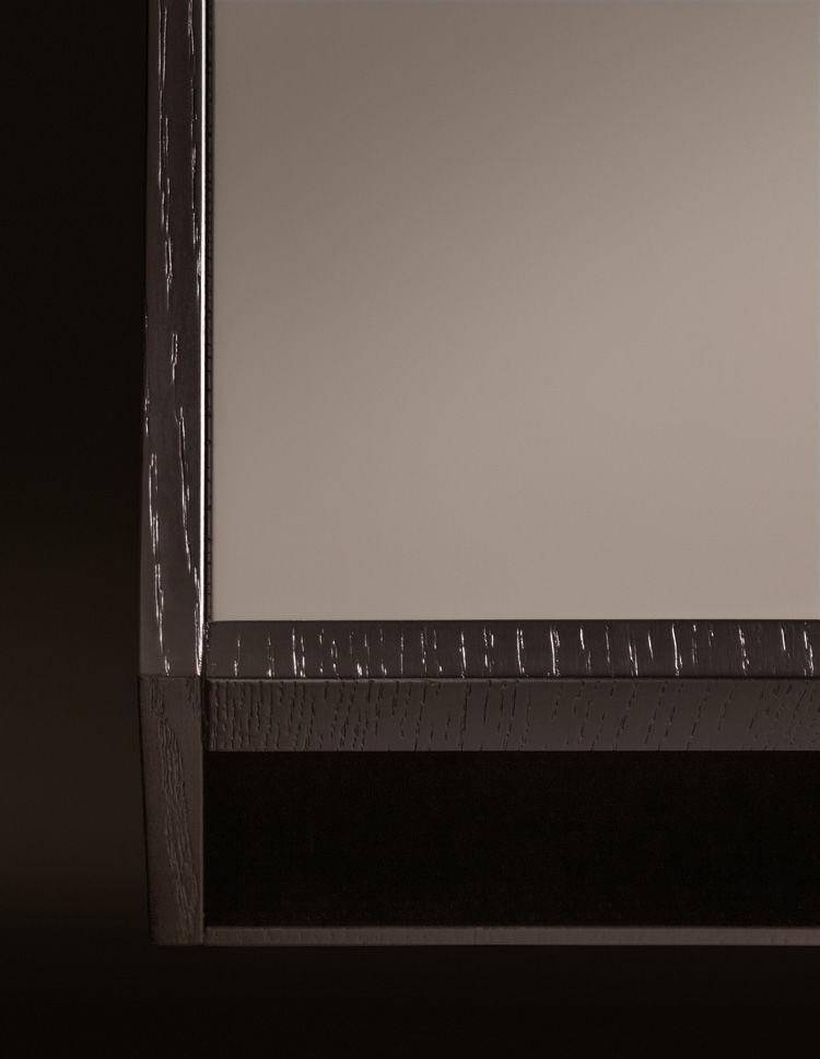 The base is made of Bronze-finished metal, while the upper part – consisting of an open shelf – comes with the structure in open pore Moka lacquered oak and the top in glossy lacquered Clay or, with the structure in mat lacquered Clay and the top in open pore Moka lacquered oak.