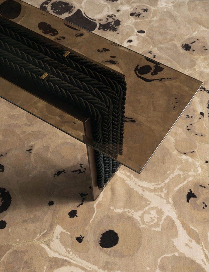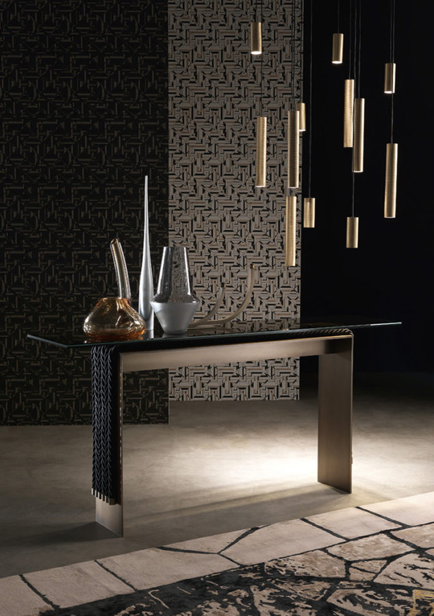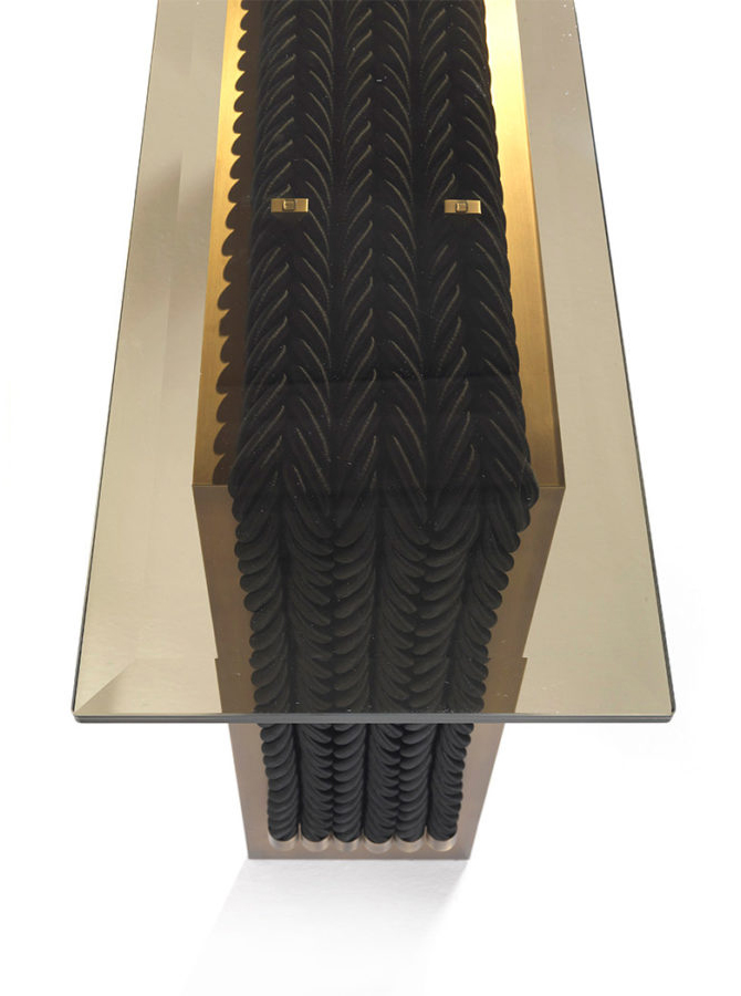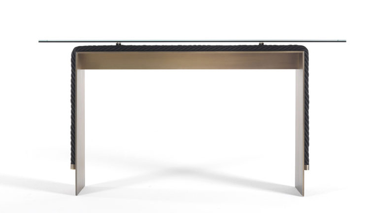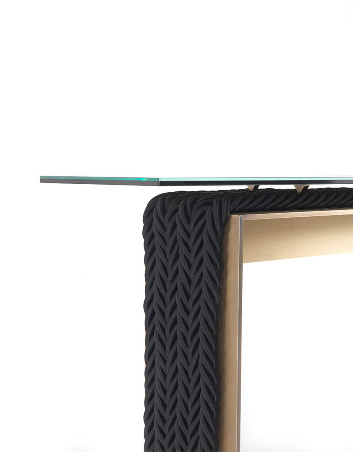 A console that combines the simplicity of the contemporary design with a complex manufacturing: the 10mm thick brass structure supports the weight of the console giving stability to the whole, thus creating an original game of contrasts between lightness and stability. Enriched by decorative ropes running along the outer perimeter of the base, the console is equipped with a refined laminated and ground bronzed glass top.