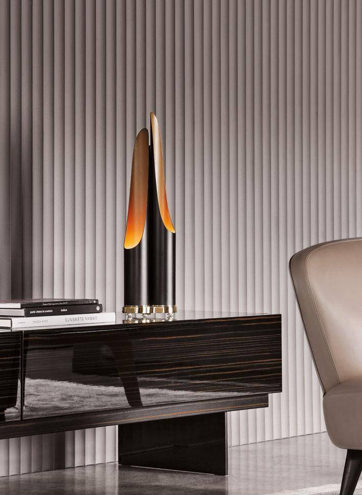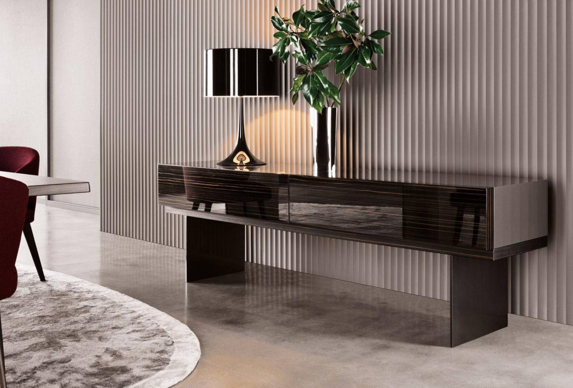 The console is available in two heights: “High” 72 cm and “Low” 50 cm, and comes with two push-pull drawers. The structure is finished in Granite color glossy lacquer, while the drawer fronts are available in polished ebony, Tobacco stained flamed oak and Moka oak.
