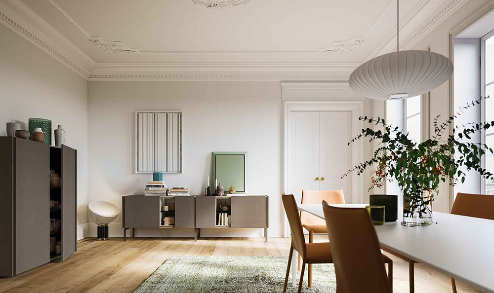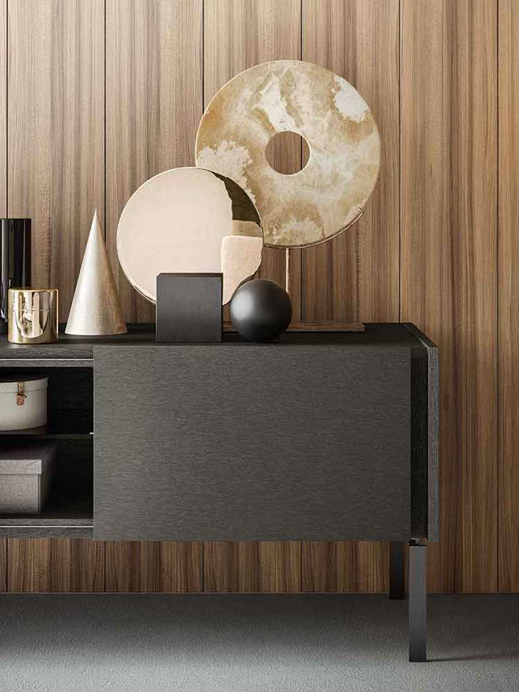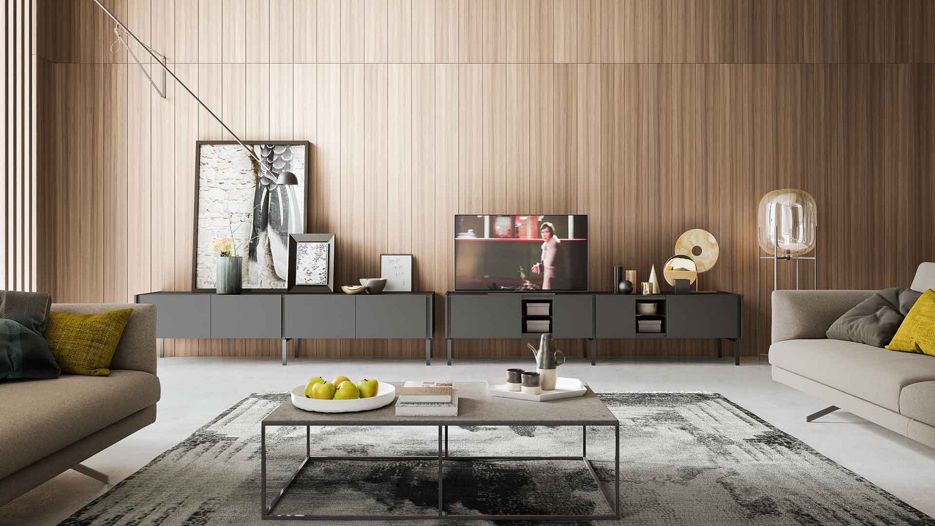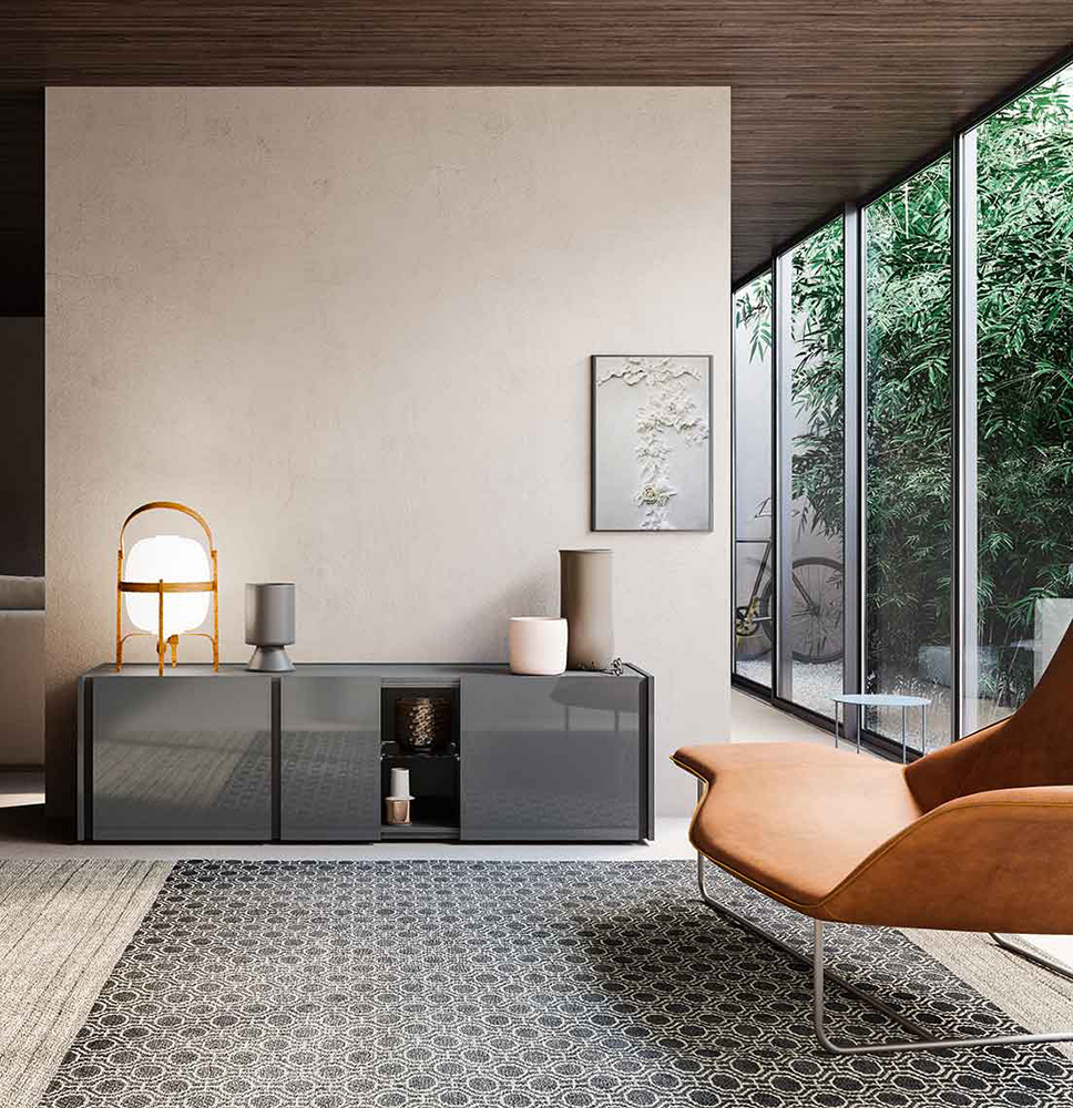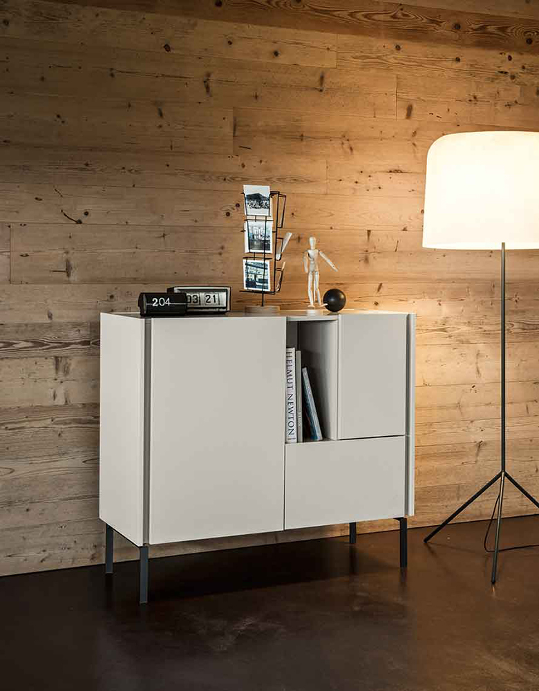 Da-Do is a living room range which includes TV units, cabinets and sideboards, which can be free-standing with feet or metal legs, or wall-mounted. Da-Do is highly customizable thanks to the two matching finishes: one for the exterior and one for the top and groove, which acts as a handle grip. An open-fronted compartment with a contrasting finish is also available.
