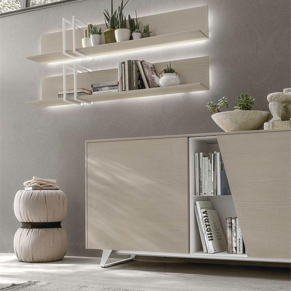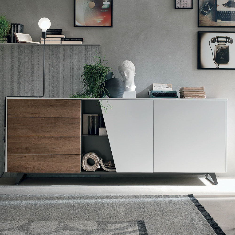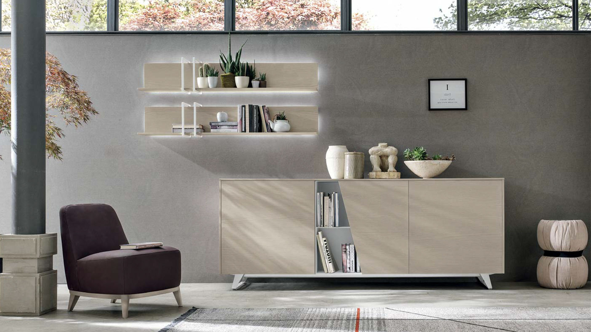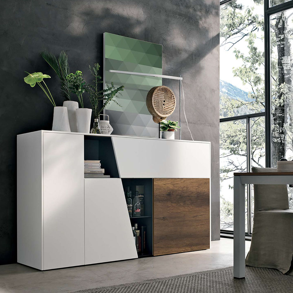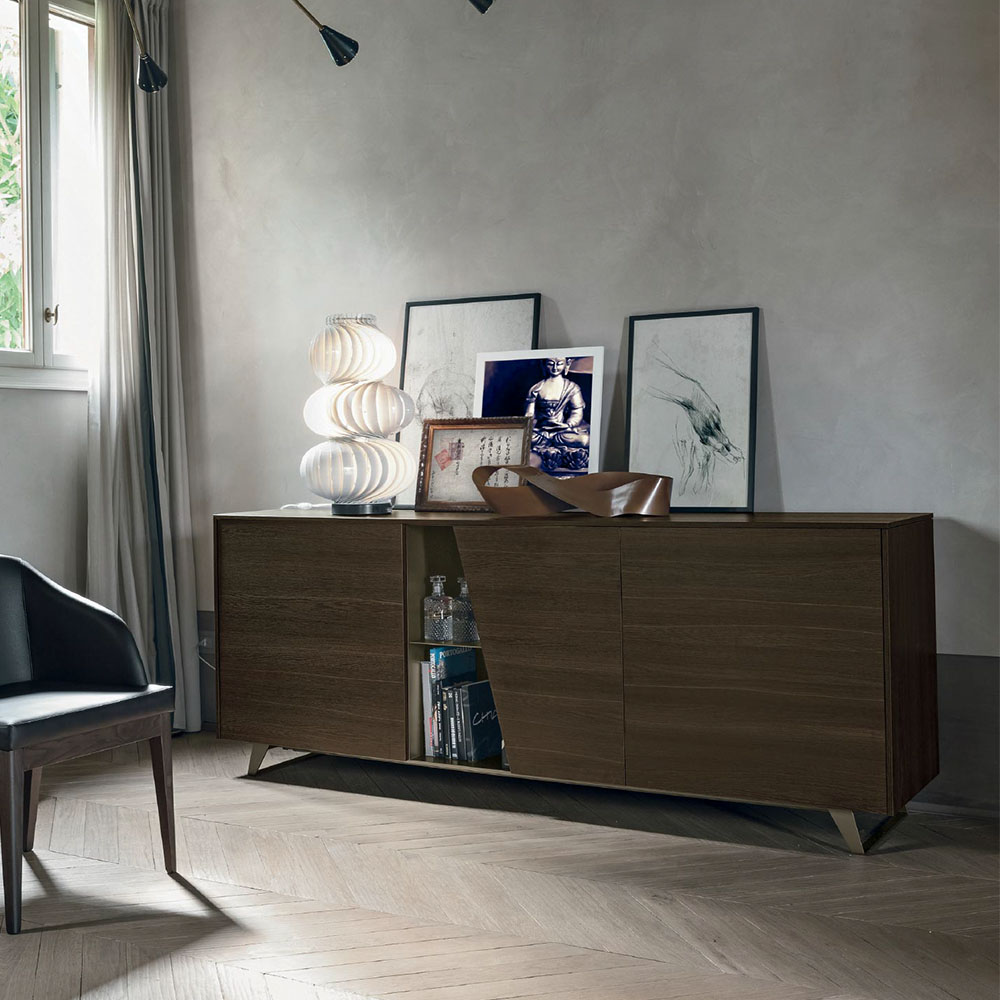 The diagonal cut-out creates open shelving for showcasing favourite objects. The sideboard features a wealth of practical storage and display solutions.