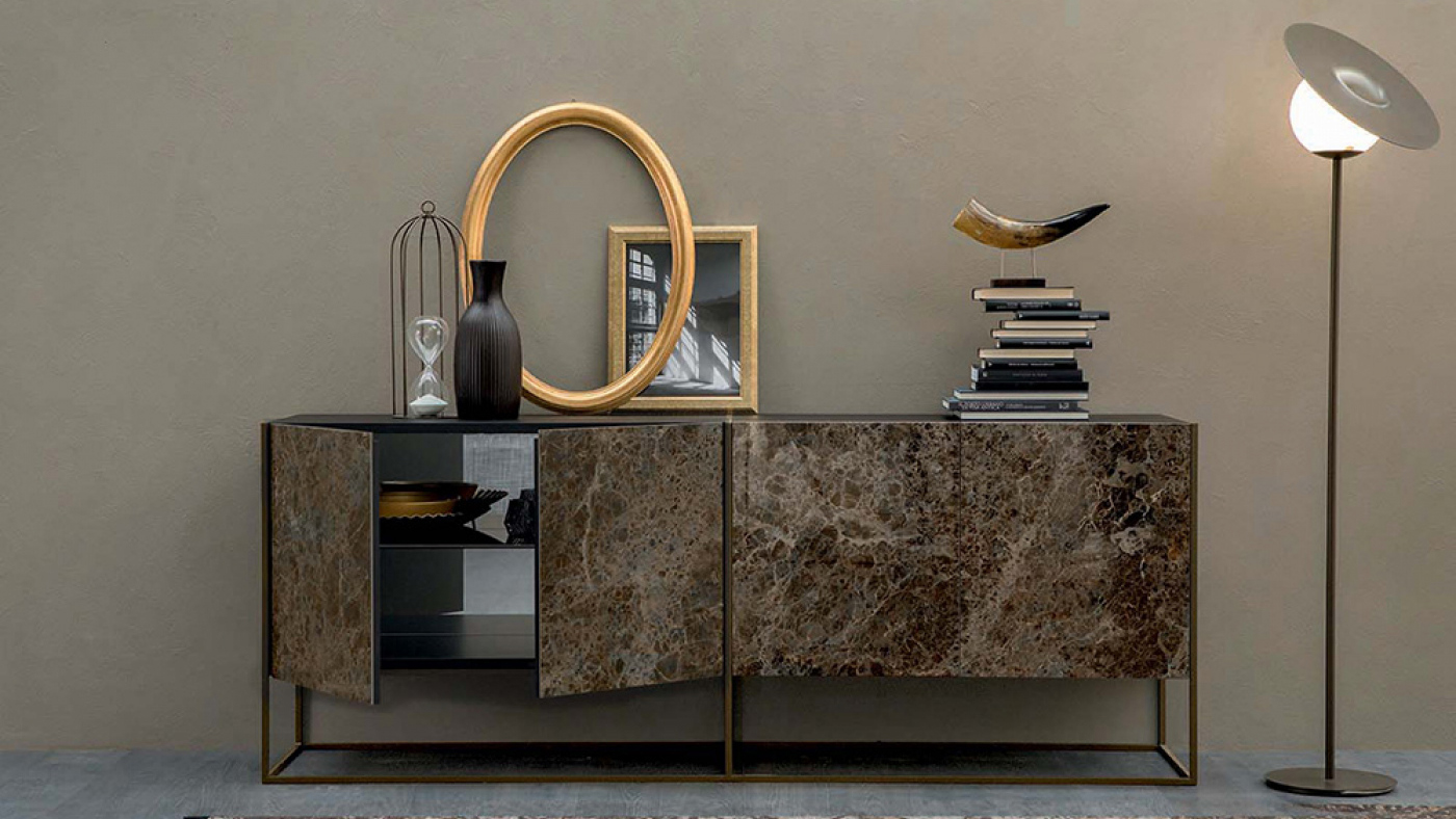 Sideboard with hinged doors in porcelain stoneware and structure in lacquered metal. Designed to be combined with the tops of the Tonin Casa tables.