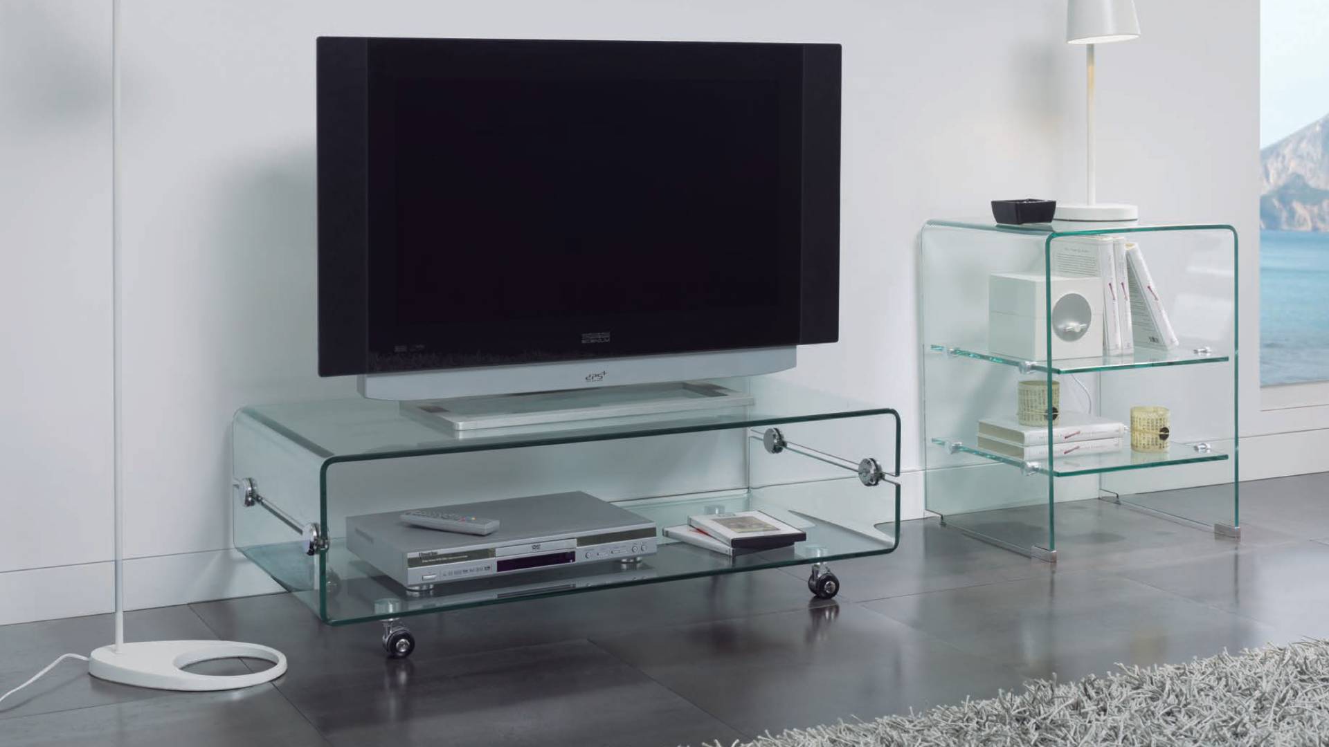 TV Table with wheels, 10mm glass. Packed in wood crate.