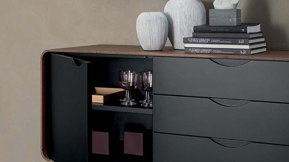 An all-round design where curved wood welcomes lacquered doors and drawers. The details make the difference and make it unique and suitable for your living.
