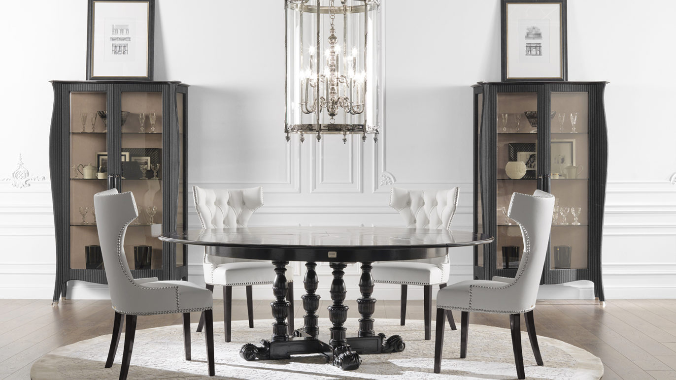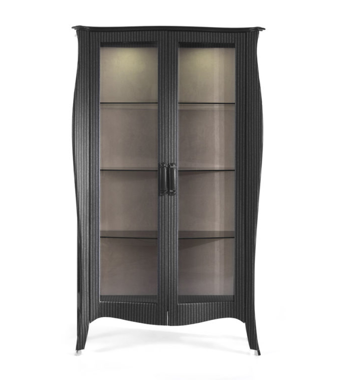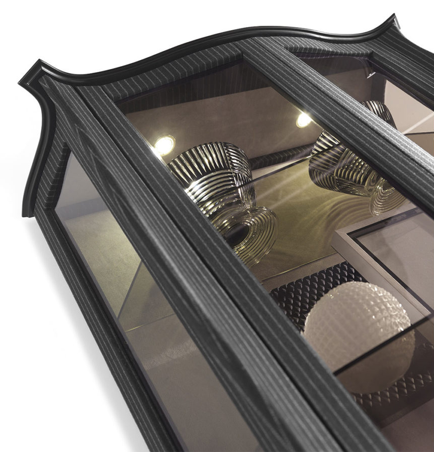 Showcase with structure in multi-layer poplar. Outside covered in fabric cat. C | L.14.04. Inside covered with microfibre. LED spotlights. Wooden top in black lacquered finishing. Bronzed glass sides, doors and shelves. Leather handles, metal leg caps.