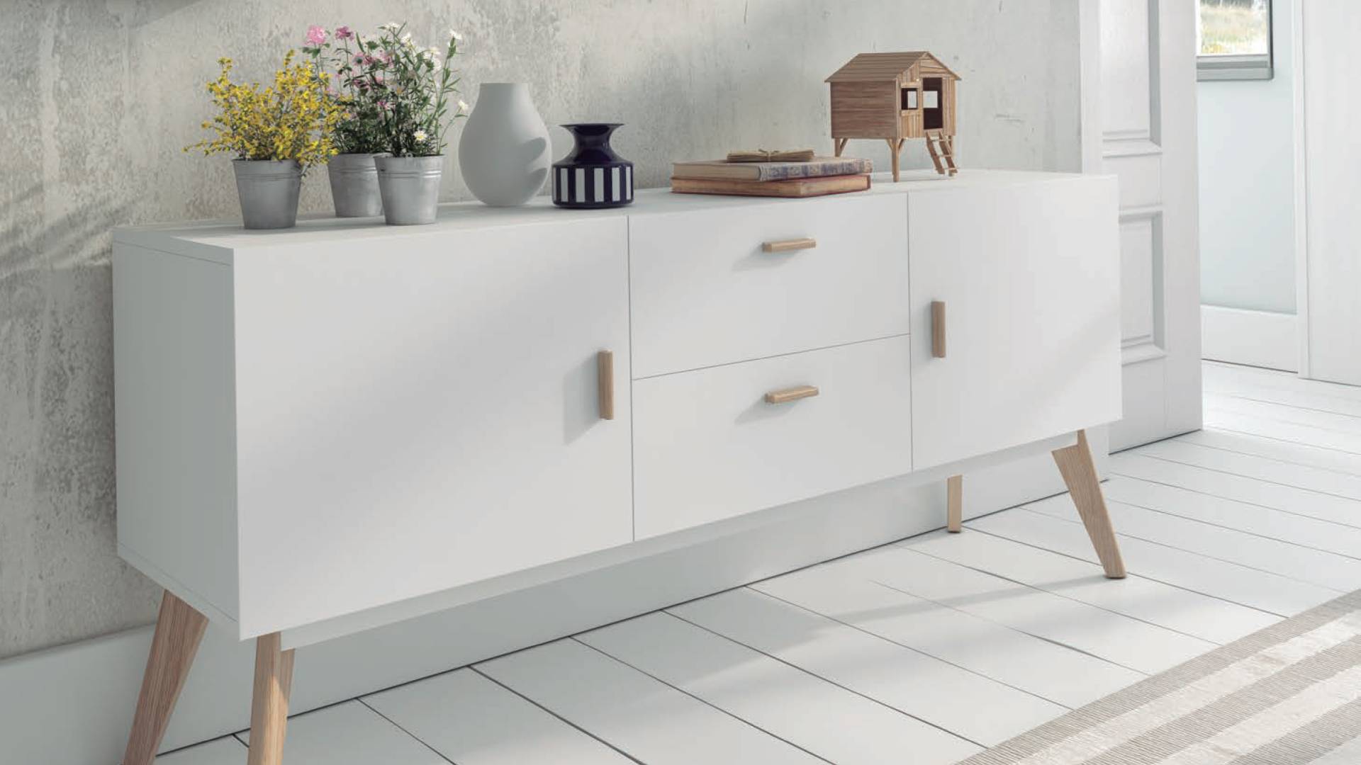 Buffet in MDF board in semimat white. Two drawers and two doors, inner shelves. Oak wood legs. Color: white.