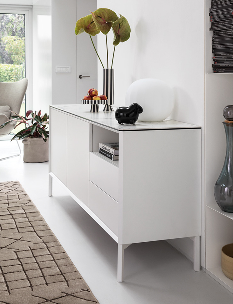 York was born from the idea of playing with the thickness of its panels in an attempt to turn a solid sideboard into a light object. York is a family of furniture for the sleeping area characterized by inclined edges and square-section front feet, rotated by 45 °, which join the perimeter of the case. This family is enhanced by the ceramic top, which guarantees exceptional resistance as well as being an easy to clean and highly hygienic solution.