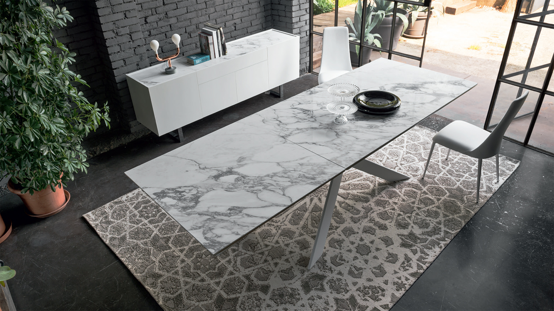 Eclisse is an extending table with an original metal base consisting of 4 interlocking V-shaped elements, reminiscent of the game Shanghai.