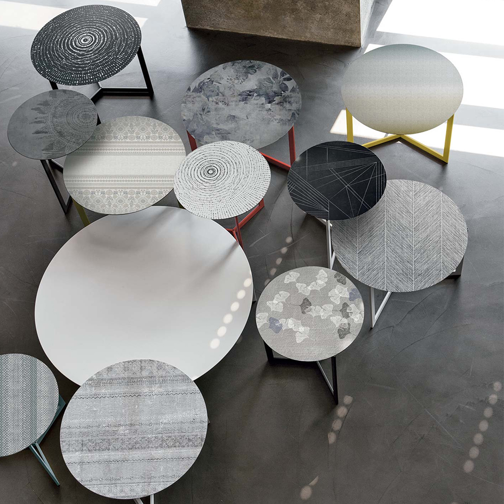 Round screen-printed occasional table for living rooms.
