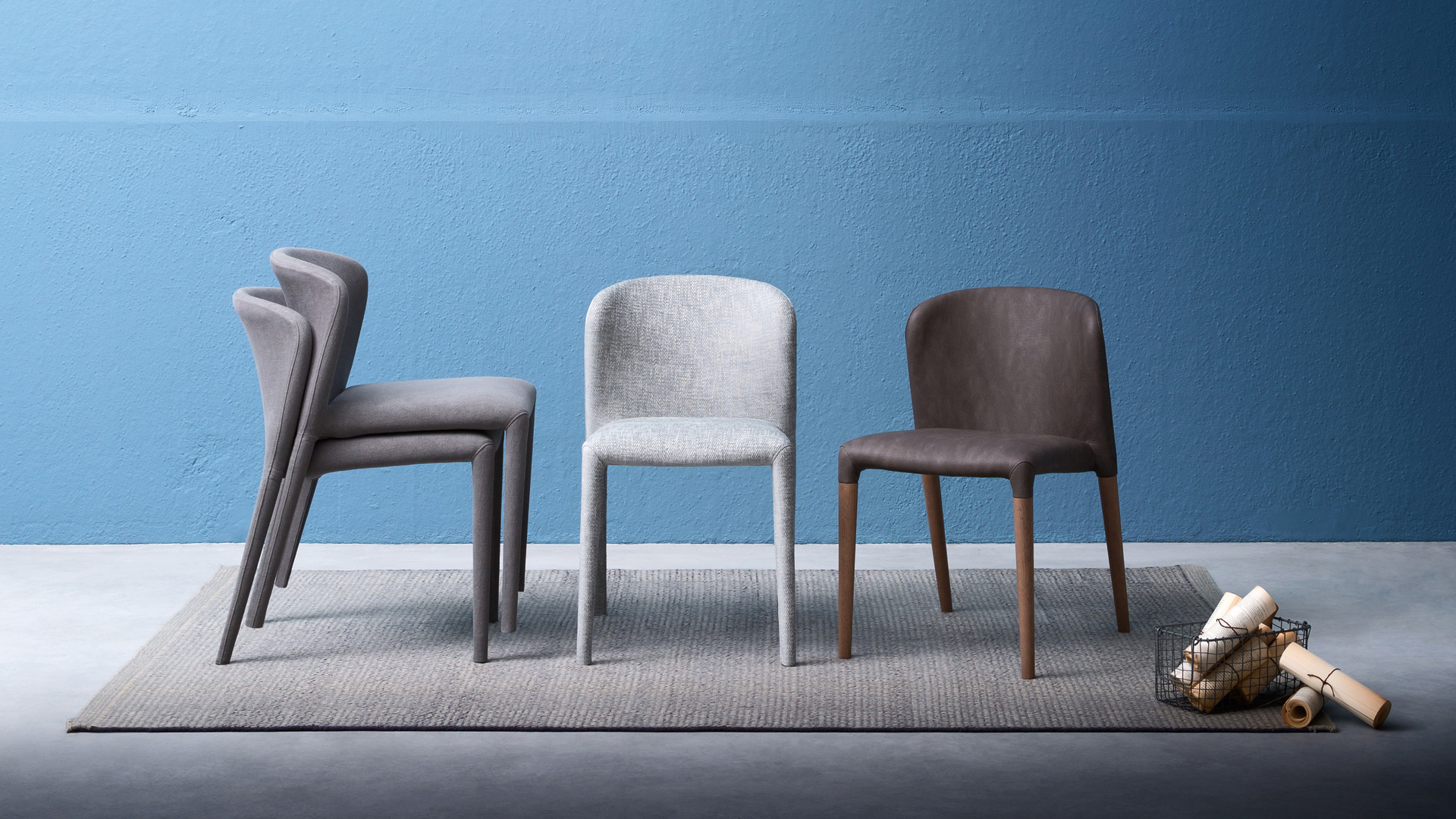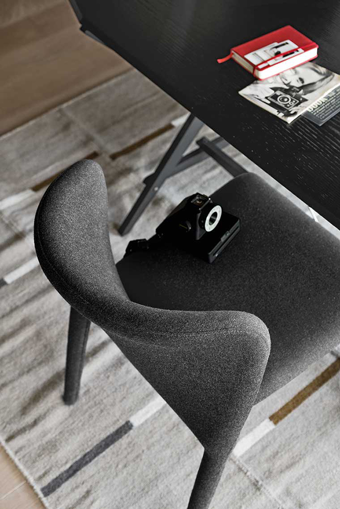Karol and Karol wood are padded chairs with removable covers in the fabric version. Karol wood combines wooden legs with upholstered seat and back.