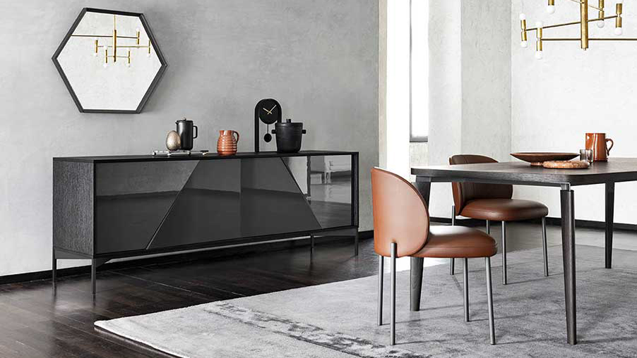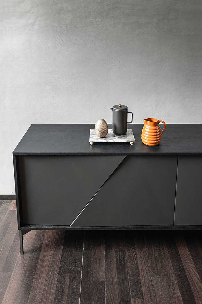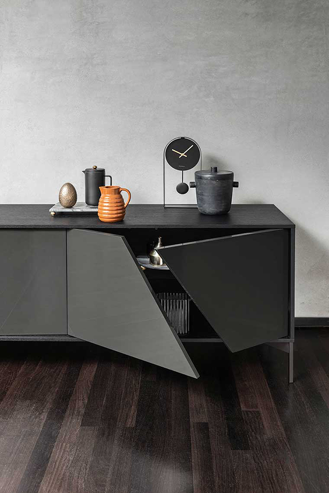 KENDO is a sideboard with unusual geometric doors: each one has a 30° cut that divides it into two parts that are not on exactly the same plane but instead slightly off -center, lending the surface a refined light and shade effect. KENDO is available in a surfaced, Fashion Wood or lacquered finish. It is also available with the doors, frame and top in different finishes or colours.