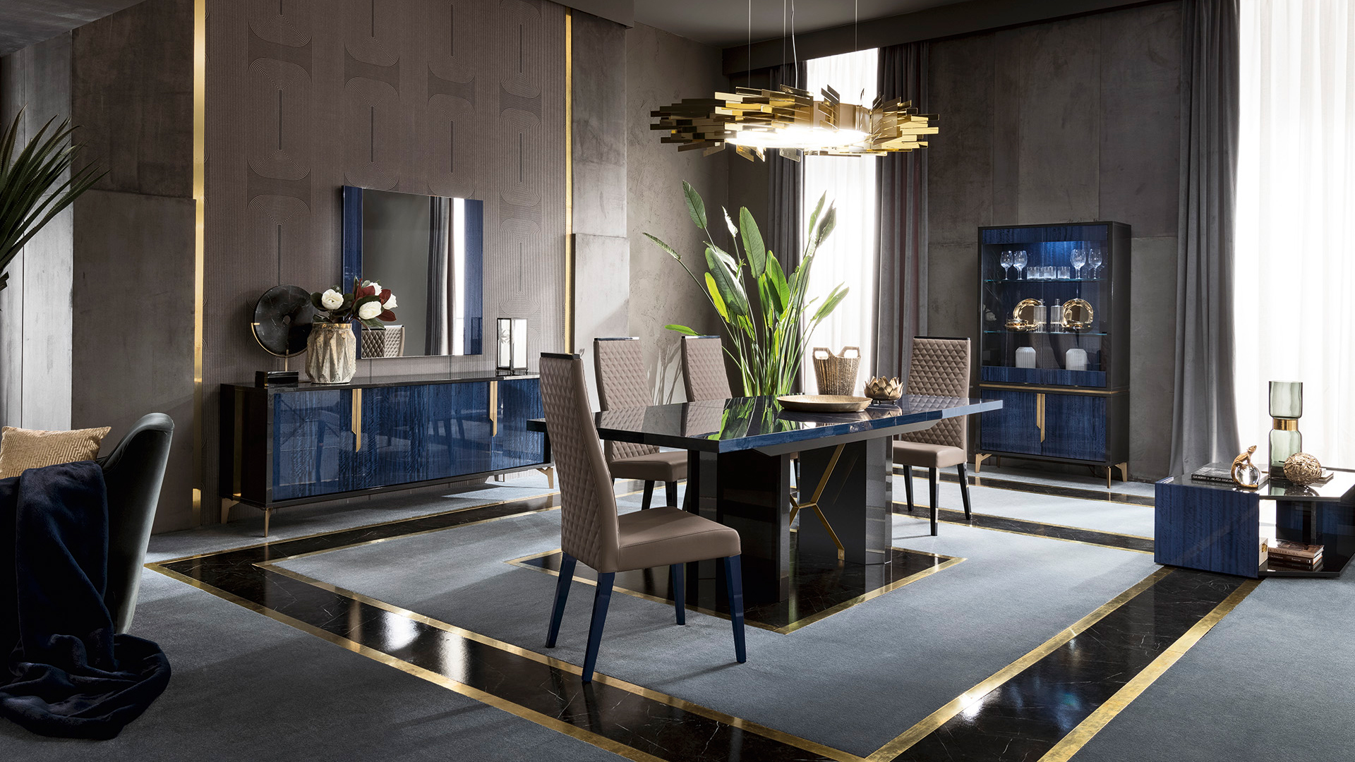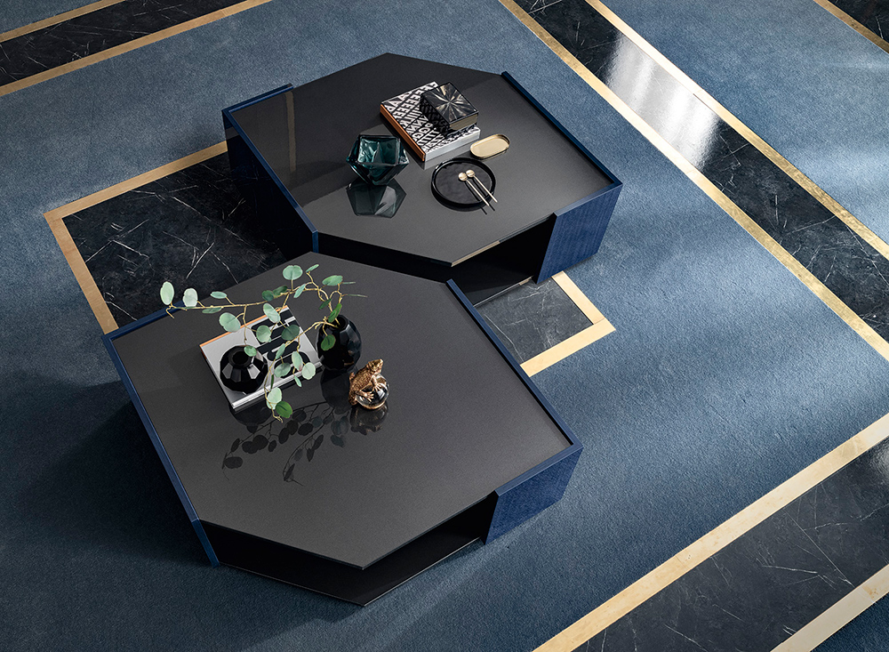 The Oceanum extendable table features two central columns, with a rectangular top, decorated with a careful arrangement of eucalyptus rings.