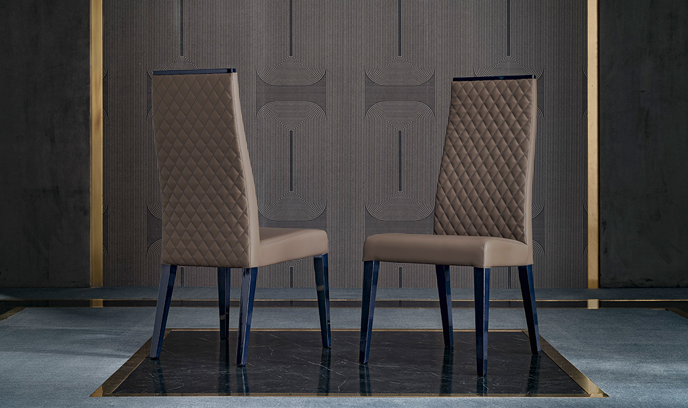 The chair from the Oceanum collection is a solid chair with a high backrest profiled under the back. The chair is upholstered with eco-leather, on both sides quilted with regular rhombus stitching, beige in color, and cobalt-colored legs.