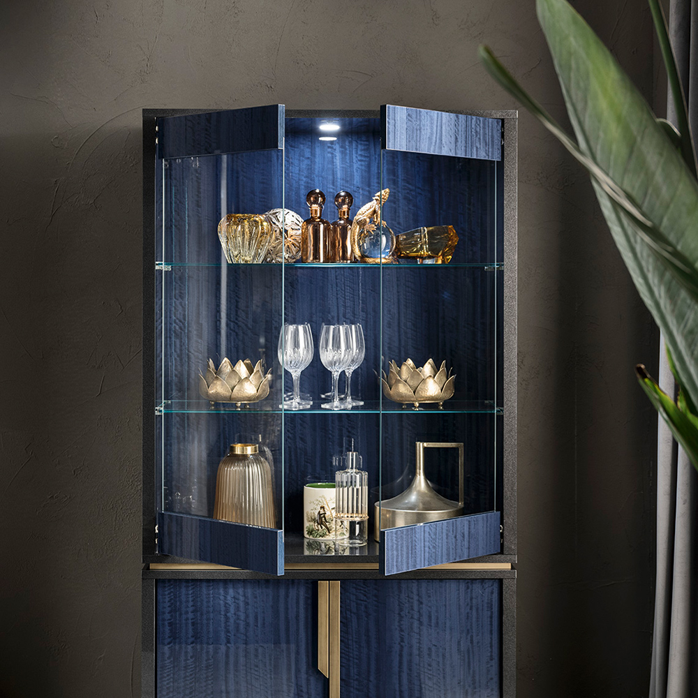 The Oceanum showcase is a delightful two-door showcase with a glass door in the upper part and a cabinet in the lower part. The site has two glass shelves, beautifully lit with LED light from above, which also nicely displays the crystals or trinkets set in it.