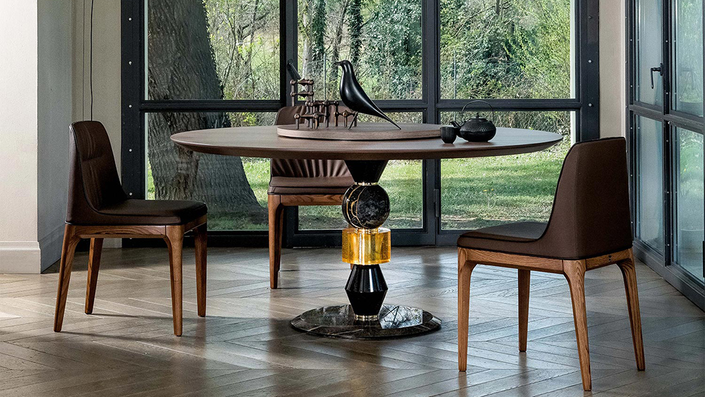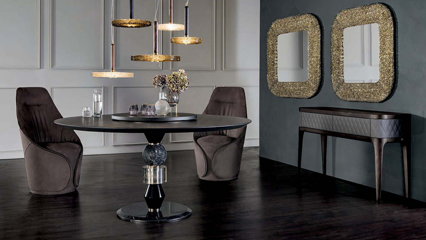 A multi-material structure characterized by real marble, fused glass and lacquered turned wood. A great aesthetic value dictated  by the materiality of the elements that are an integral part of this table. Available in multiple essences and with Lazy Susan.