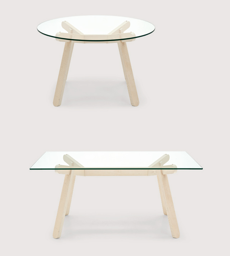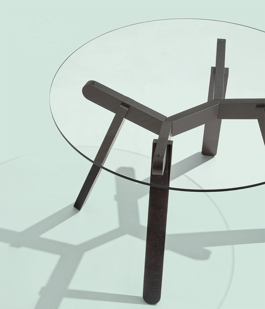 Peeno is an exquisite architectural creation of intricately interlocked pieces of wood. The various parts interweave to create a non-extending table upon which rests a round top made from transparent tempered glass.