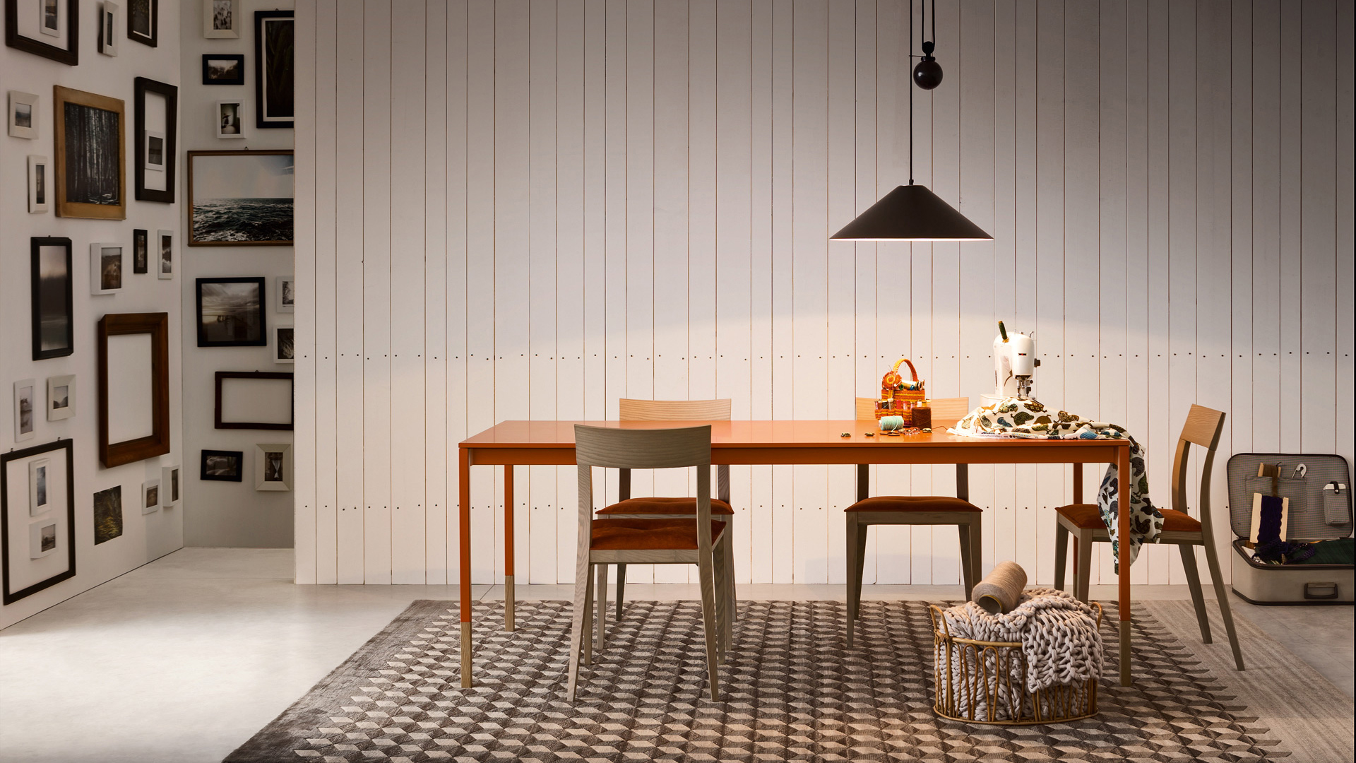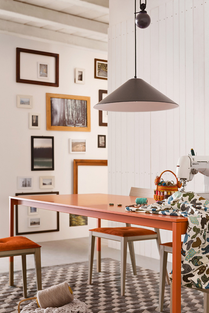 The Aliante table has a metal structure either square or rectangular, and it is available in the fixed or extending version. This table stands out for the presence of wooden “socks”, which are available in various finishes to match the lacquered upper part of the legs according to personal taste.