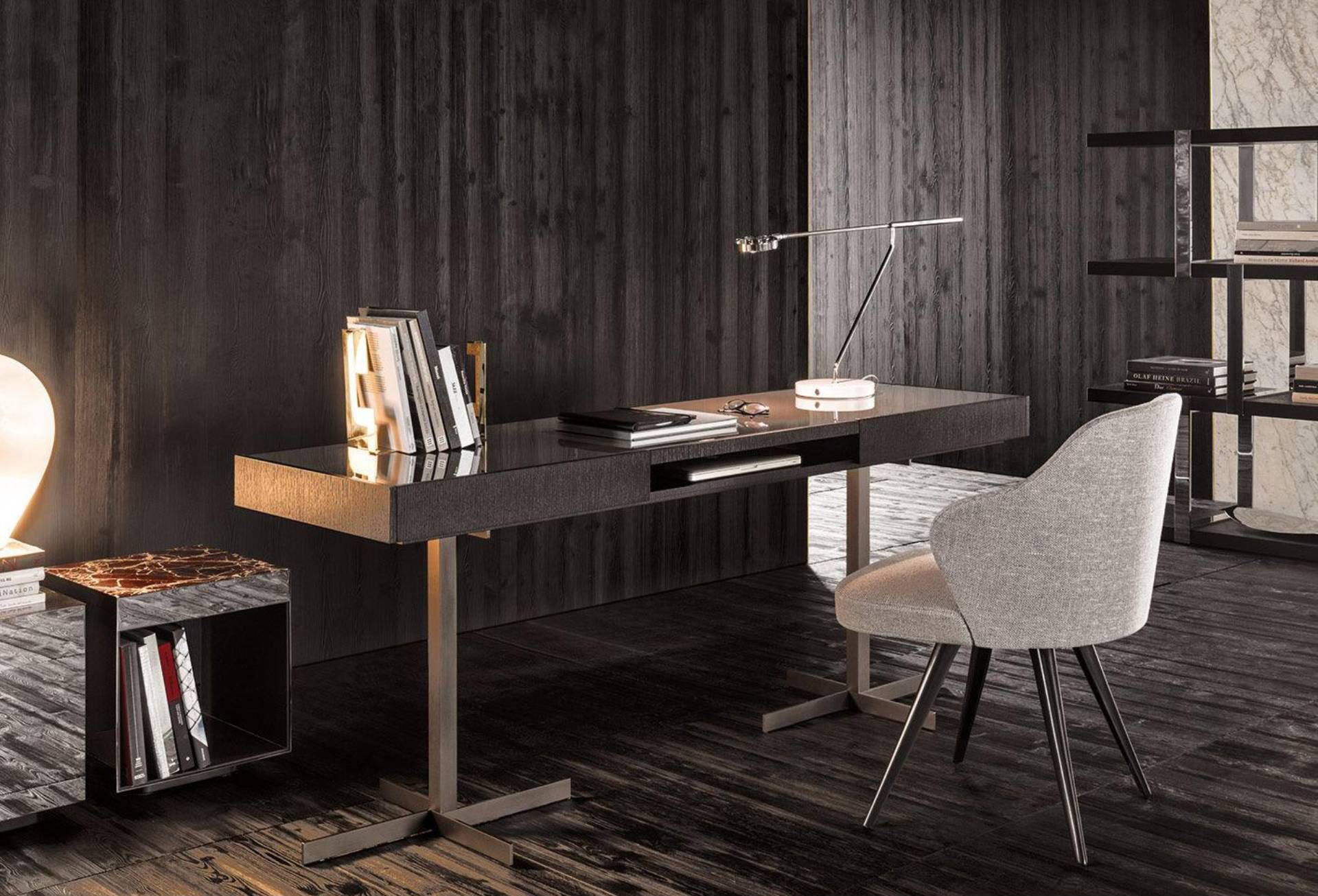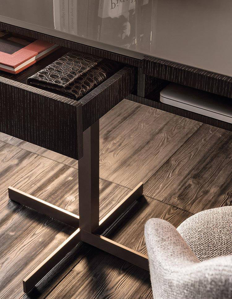The Close desk fuses functionality and tasteful, lasting design and is comfortably at home in either the living room or the bedroom. The base is made of Bronze-finished metal, while the upper part – consisting of an open shelf and two useful drawers – comes with the structure in open pore Moka lacquered oak and the top in glossy lacquered Clay or, with the structure in mat lacquered Clay and the top in open pore Moka lacquered oak.