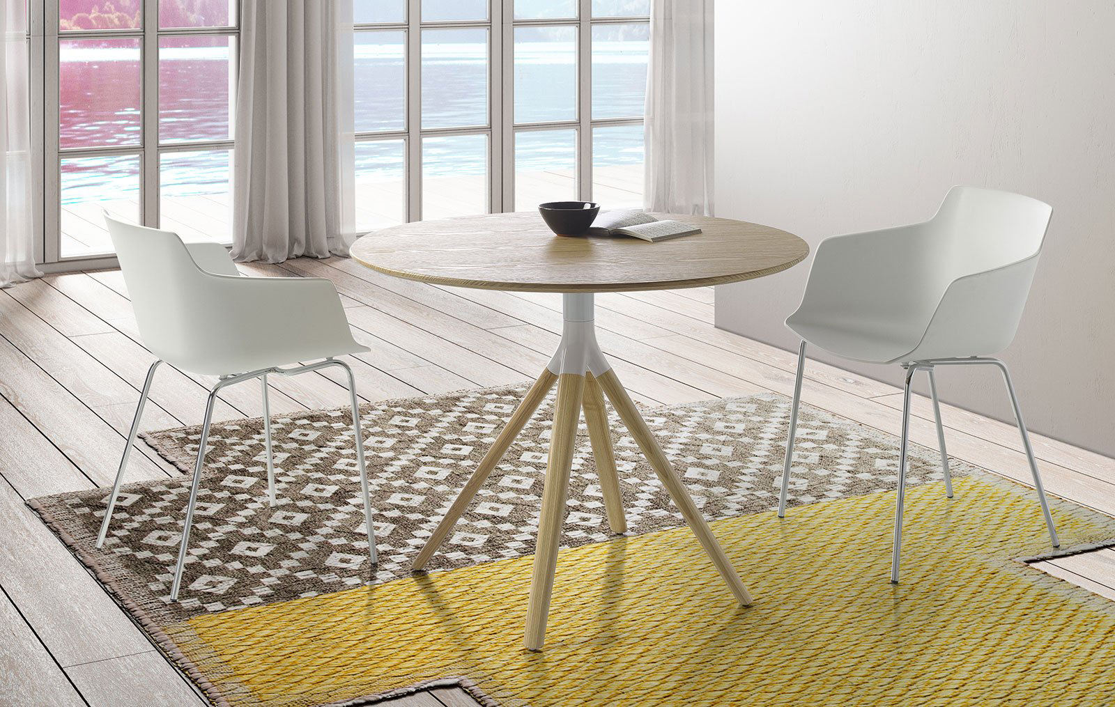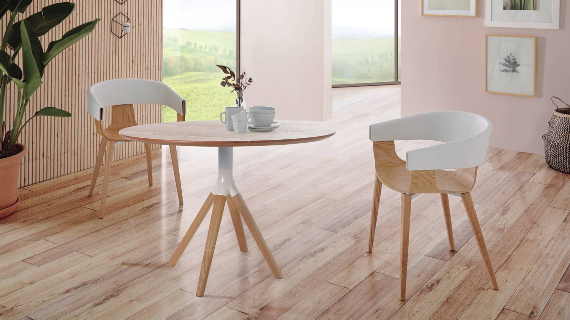 Designer Round dining table top ashwood veneered, metal frame and solid ashwood legs.