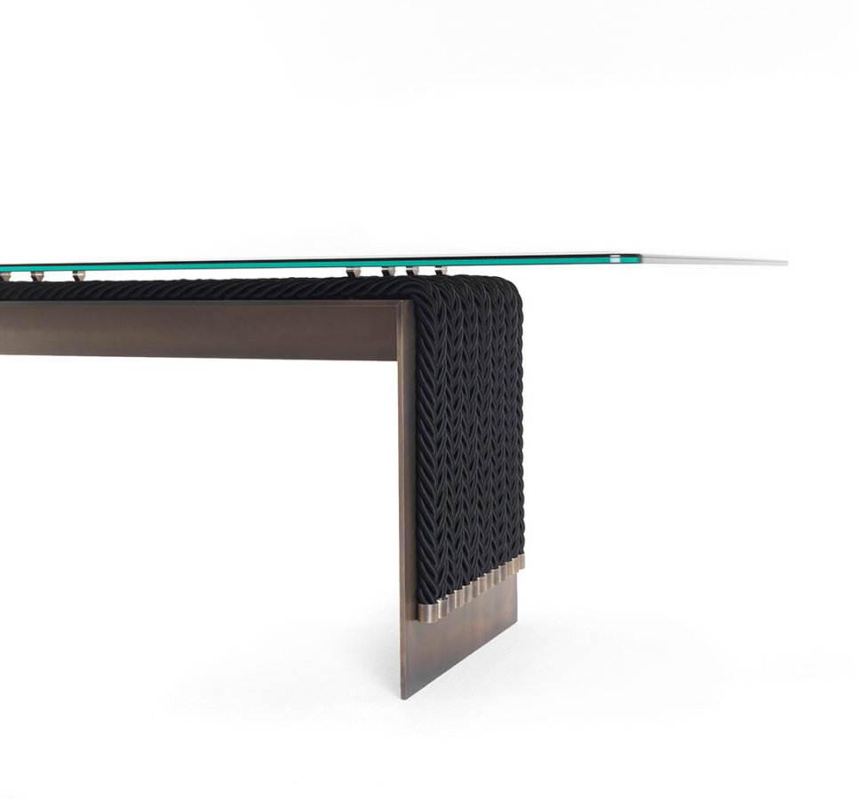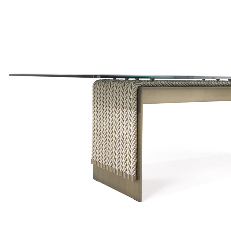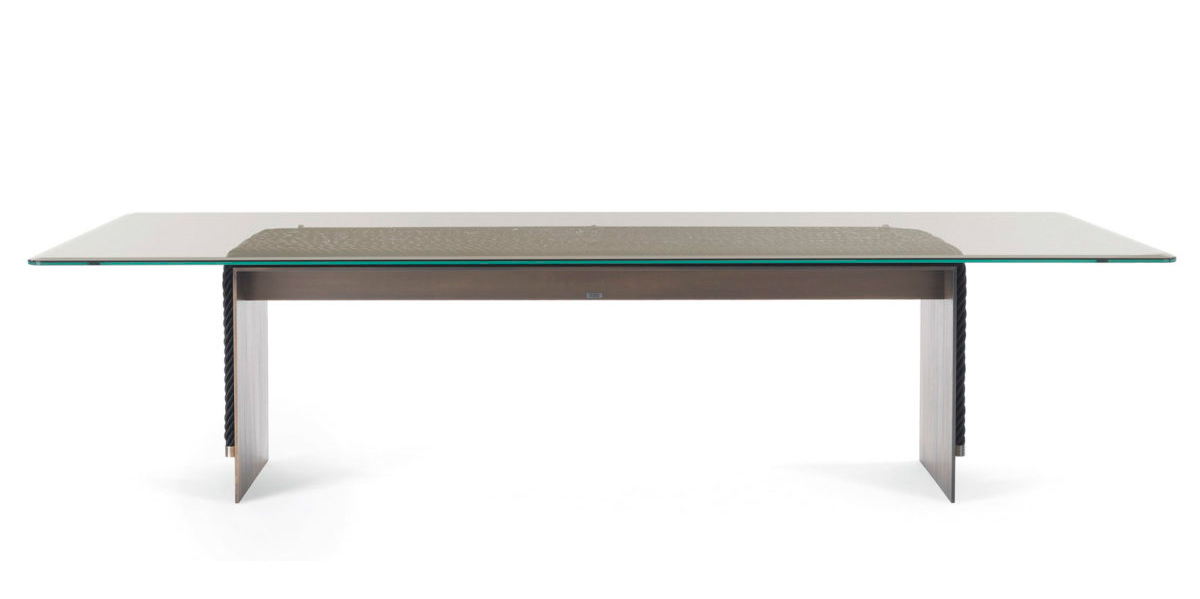 Evolution of the Glasgow line presented at the Salone del Mobile 2018, the dining table combines the linearity of the design with the complexity of the workmanship. Enriched with decorative strings, it presents a top in coupled glass bronzed glass and a metal structure with a bronze finish.