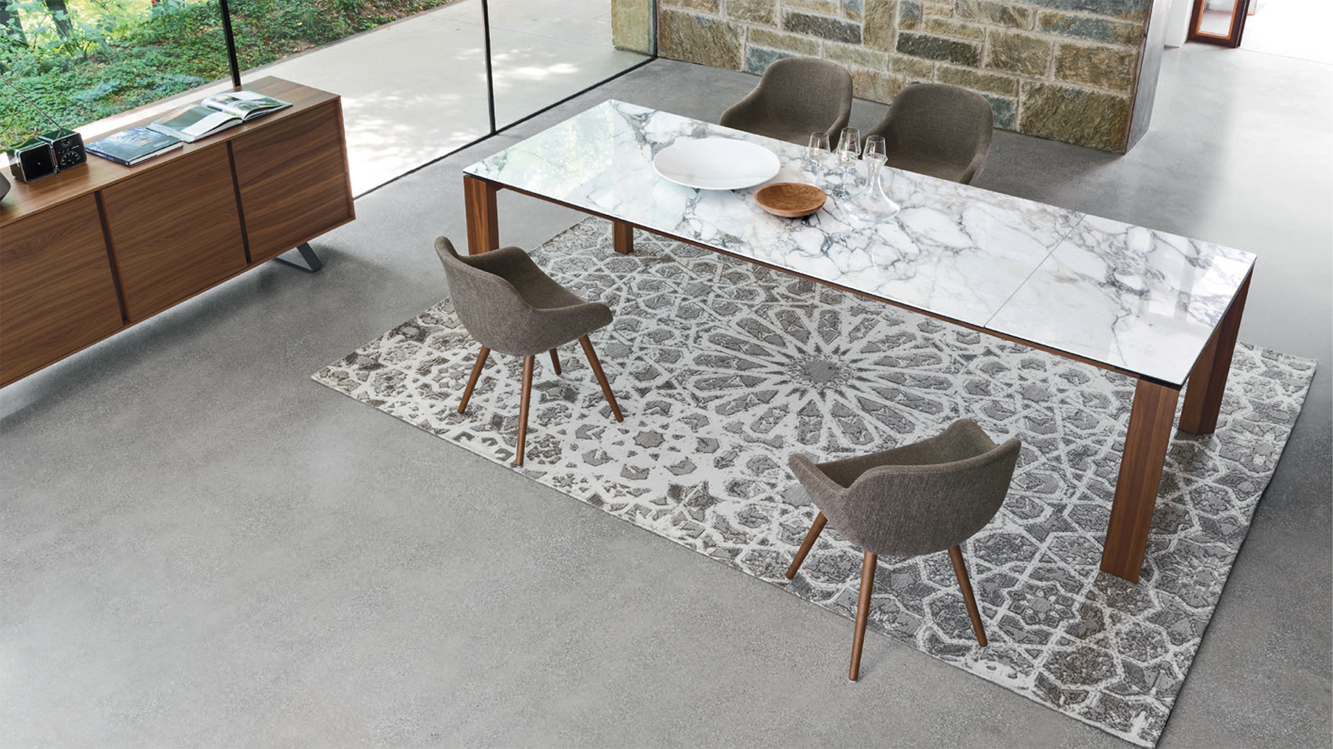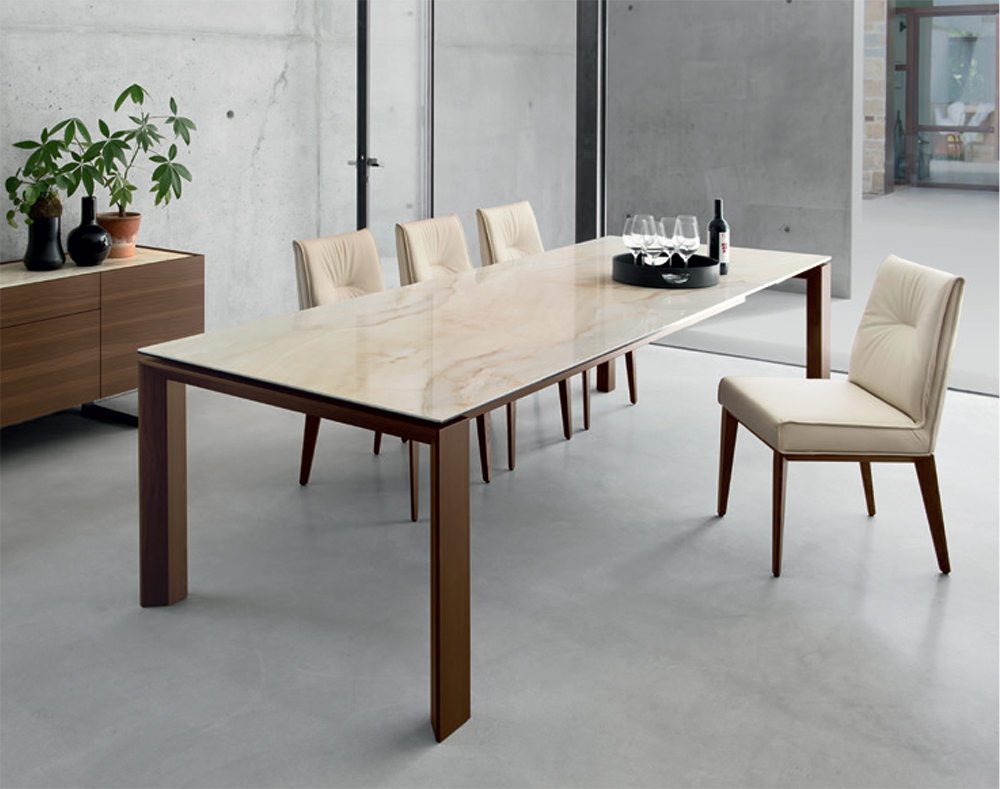 The Omnia table contains an ingenious mechanism able to expand the top surface. Pull the frame towards you so that the two legs with hidden castors slide on one side allowing the leaf to be pulled out. With a simple rotation the leaf fitted on metal tracks comes out of its housing and lines up with the top. The perimeter legs have a slanting cut in the inside part, a distinctive detail in the aesthetics.