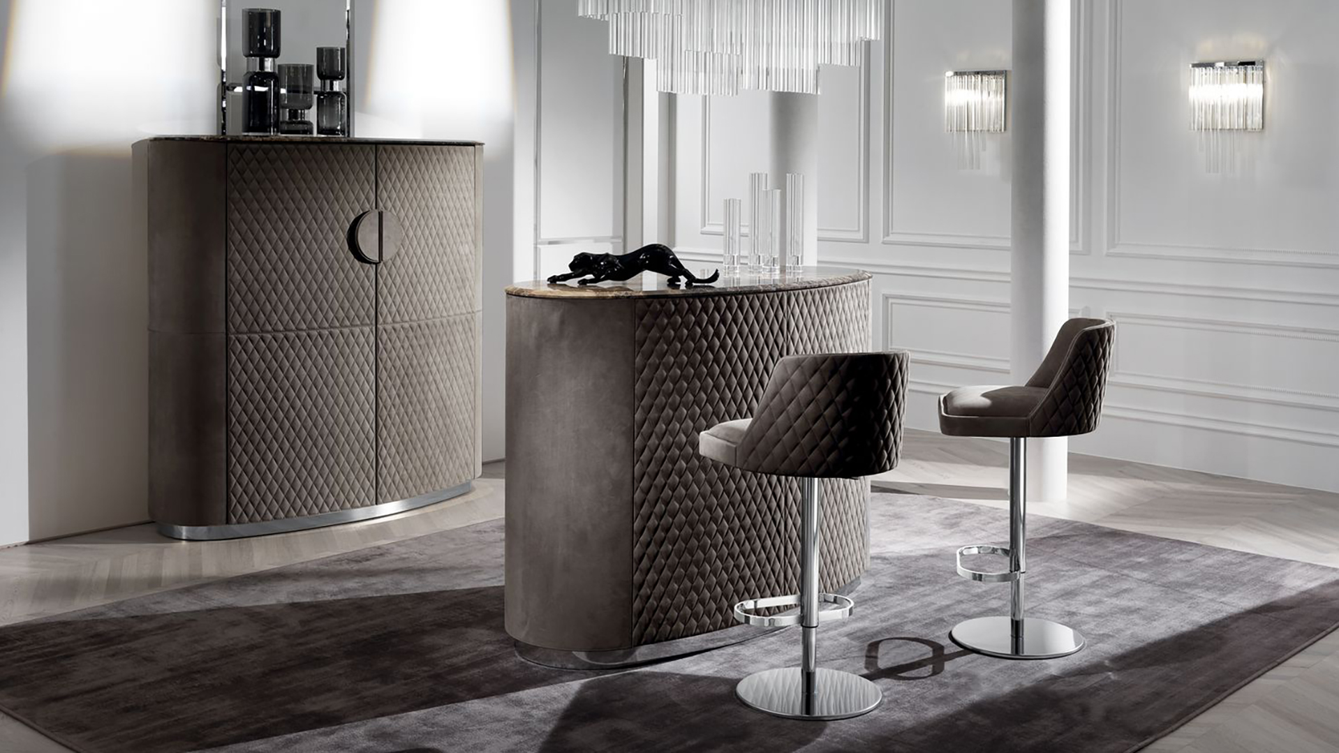 Vogue designer bar. The body of the model, slightly curved, is made of MDF panels on a solid metal base. Outside, it is covered with soft nubuck or leather. The tabletop is made of luxurious marble, presented in several textures. The internal design of the bar includes three shelves and two drawers hidden by doors. The facade of the product is decorated with quilted stitching. Non-standard, but at the same time sophisticated bar for a modern interior.