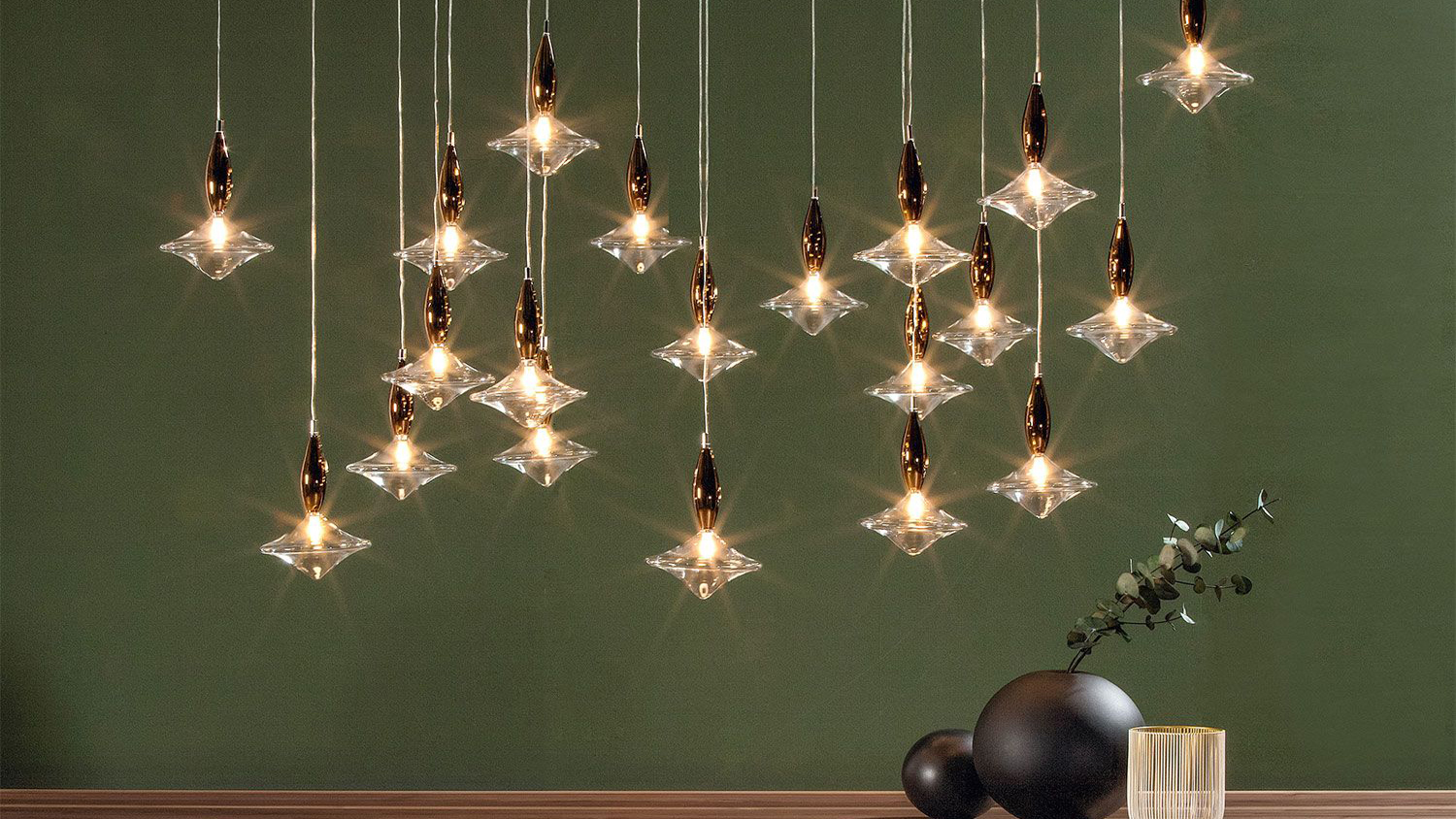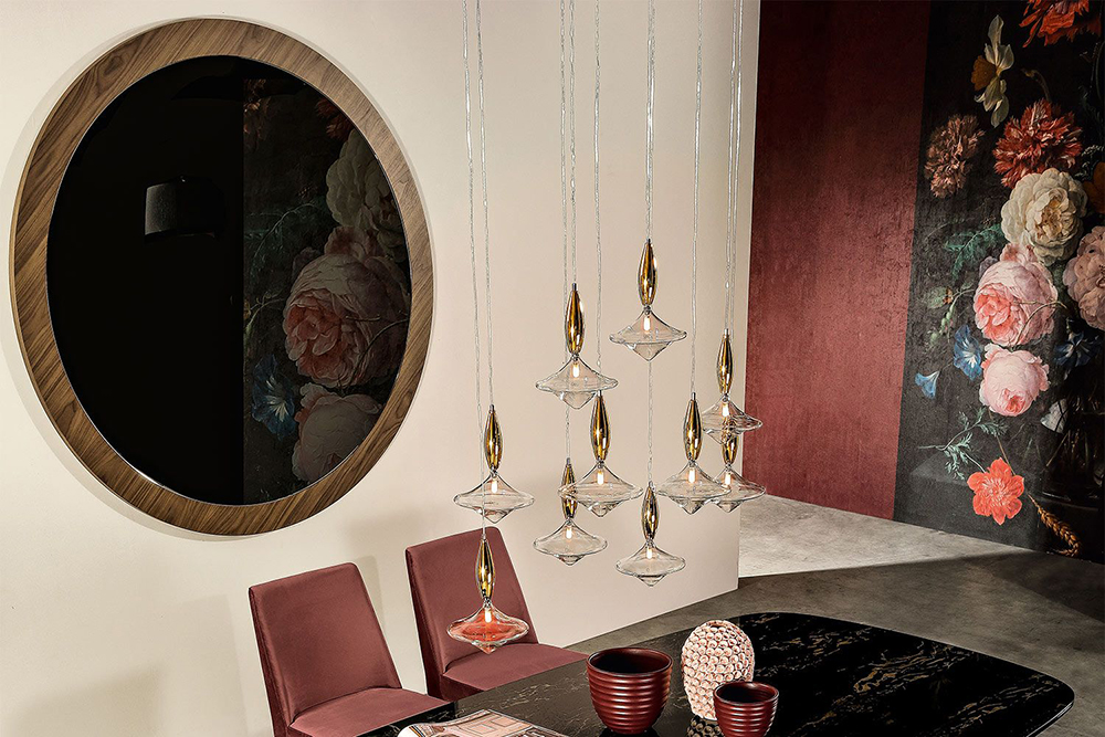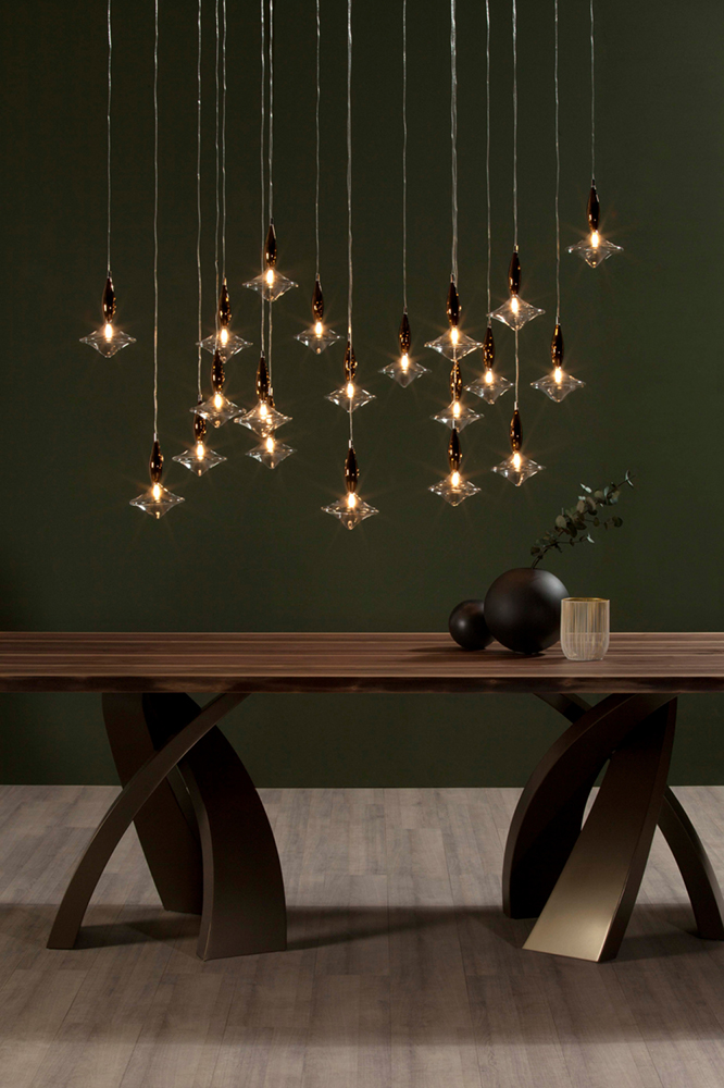 A hanging lamp, thought to create a constellation above your tables. Etoile is made of a lighting part - made of transparent glass - and an upper part made of either bronze, or gold mirror; the one, six, ten or twenty lights versions, allow to create your ideal set, your perfect light.