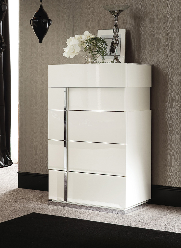 This set features an elegant White High Gloss finish, Chrome accents, and luxurious White Carrara Marble finished tops on the nightstand, chest & dresser. The LED Light Kit enhances the overall design of the Canova by illuminating under the bed and within the headboard.