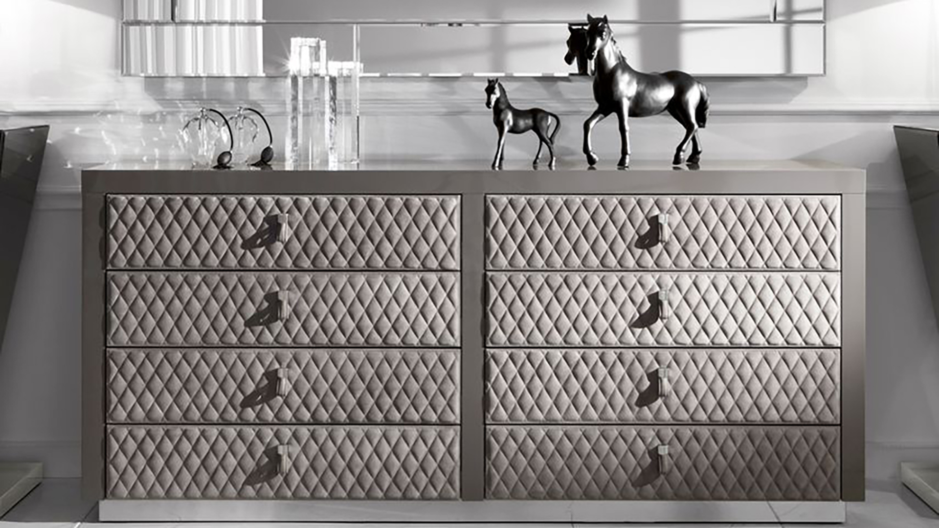 Chest of drawers with eight drawers in leather upholstery. The base is made of metal. Other finishes and upholstery options are available.