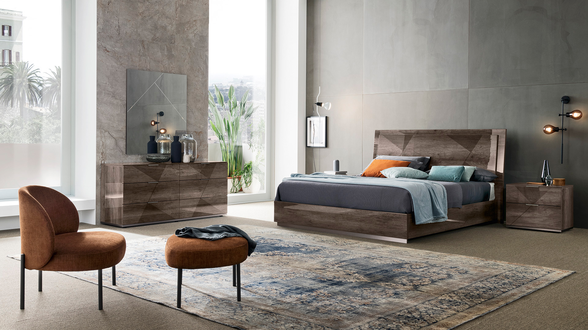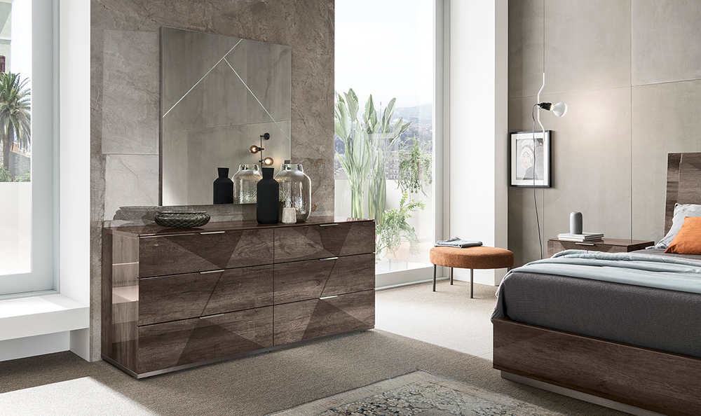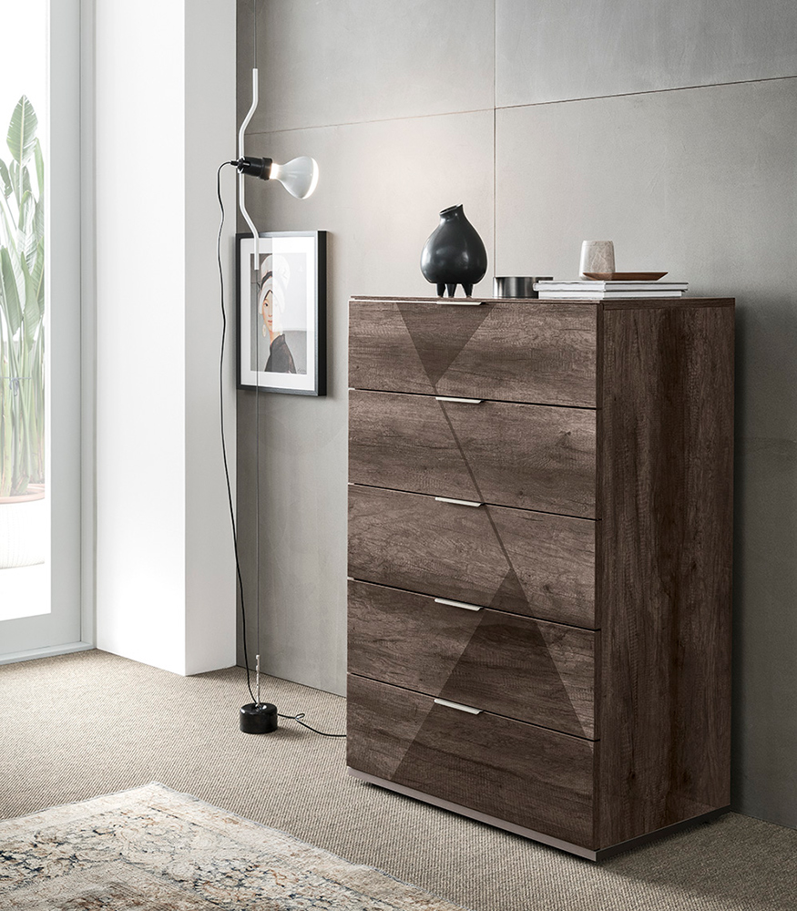 Made of real wood veneer and covered with Rim surfaced oak Gloss veneer, the furniture lasts long and looks really amazing. Platform Bed Favignana is offered in three sizes: queen, king, and California king. There is also a complete set of case goods: nightstands, dresser, mirror, and chest.