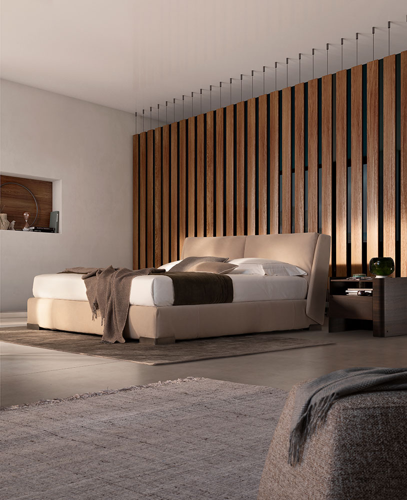 Fenice is the bed which effortlessly brings together aesthetics and function in a triumph of finesse. Cosseted by the big plush cushions on a pectacular looking and the slightly tilted headboard which provides a highly comfortable posture for reading and - obliquely inclined as it dovetails with the bedframe - it also creates an elegant geometric detail.