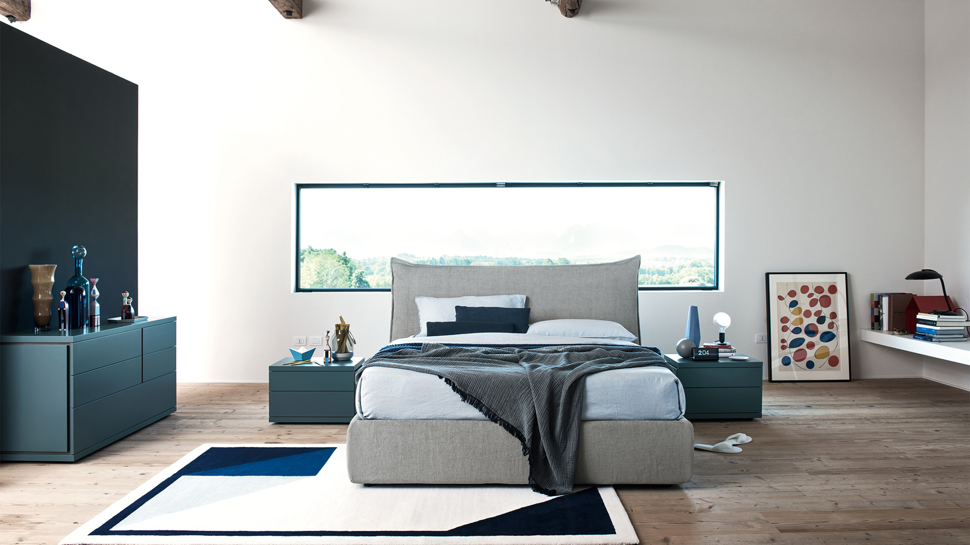 A soft and comforting upholstered bed characterized by an enveloping headboard enriched with visible contrast stitching.