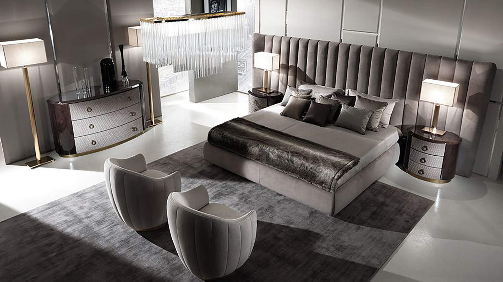 Bed with upholstered headboard Hermes Maxi - the right choice for comfortable sleep and relaxation. The wide back is covered with a soft base and decorated with vertical machine stitches that form an original relief. The soft frame is also designed to match the headboard. Silver-plated metal legs complete the design of the furniture. An art deco style bed will fit into the interior of a modern bedroom.