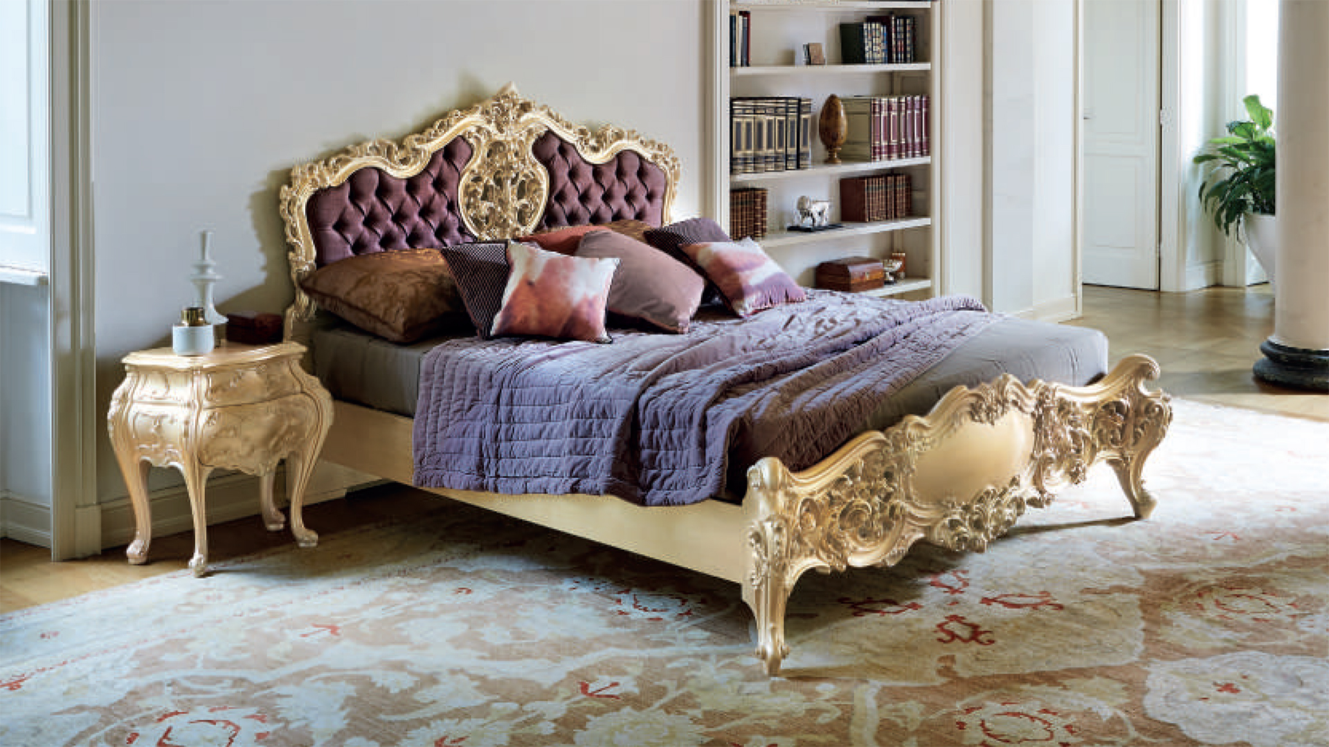 Bedside table with 2 drawers. Wooden tabletop with glass top. Decor - polyurethane foam. Other finishes are possible.