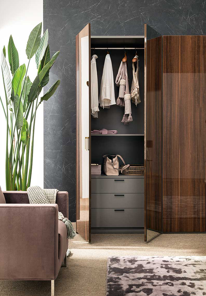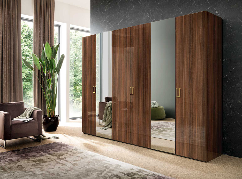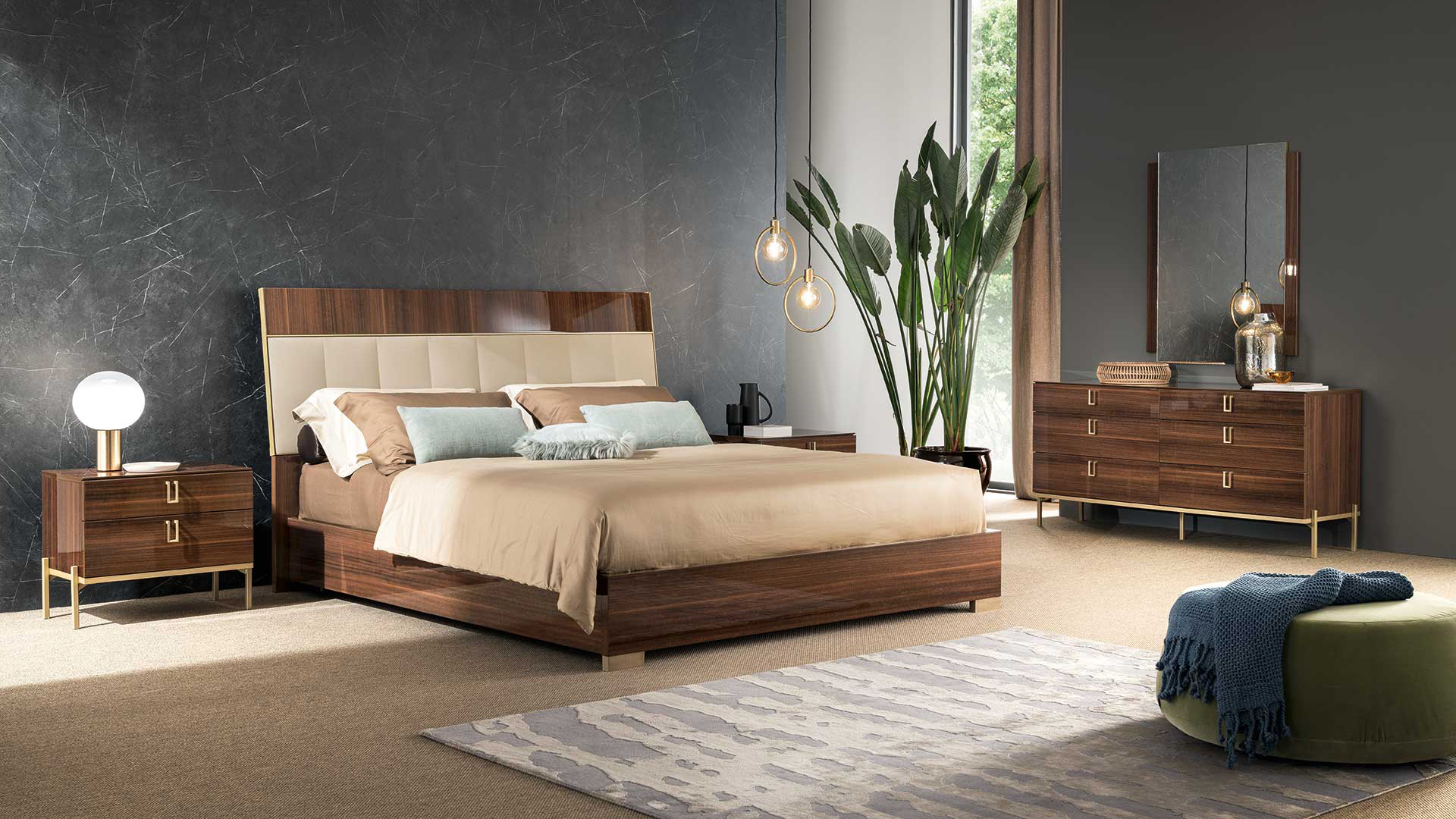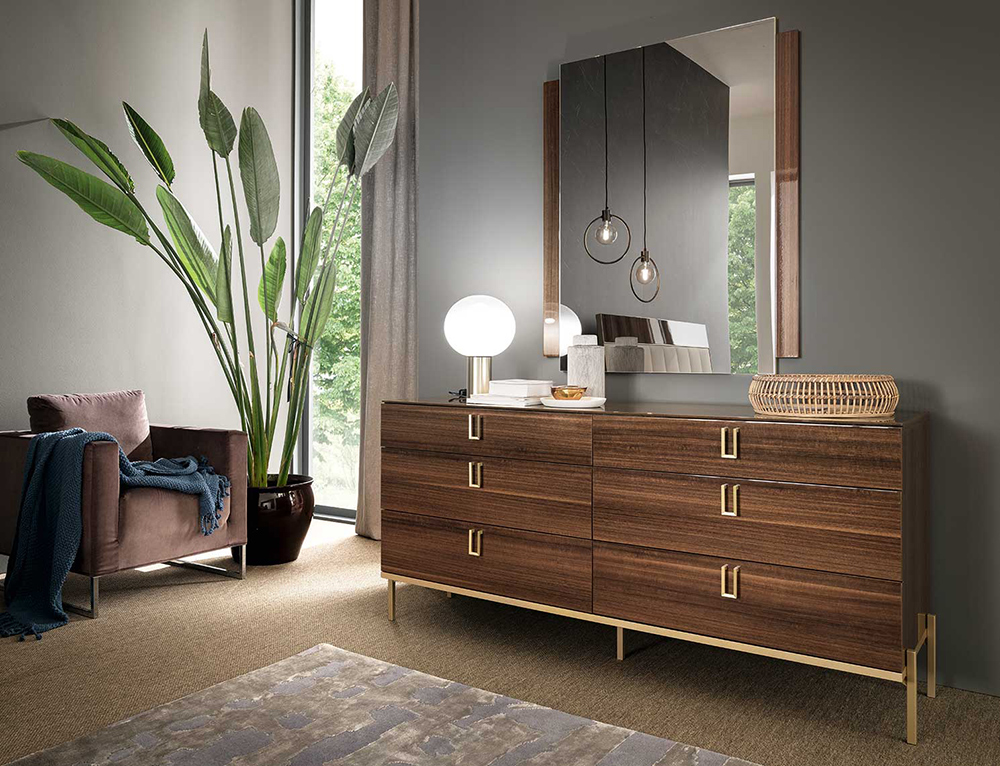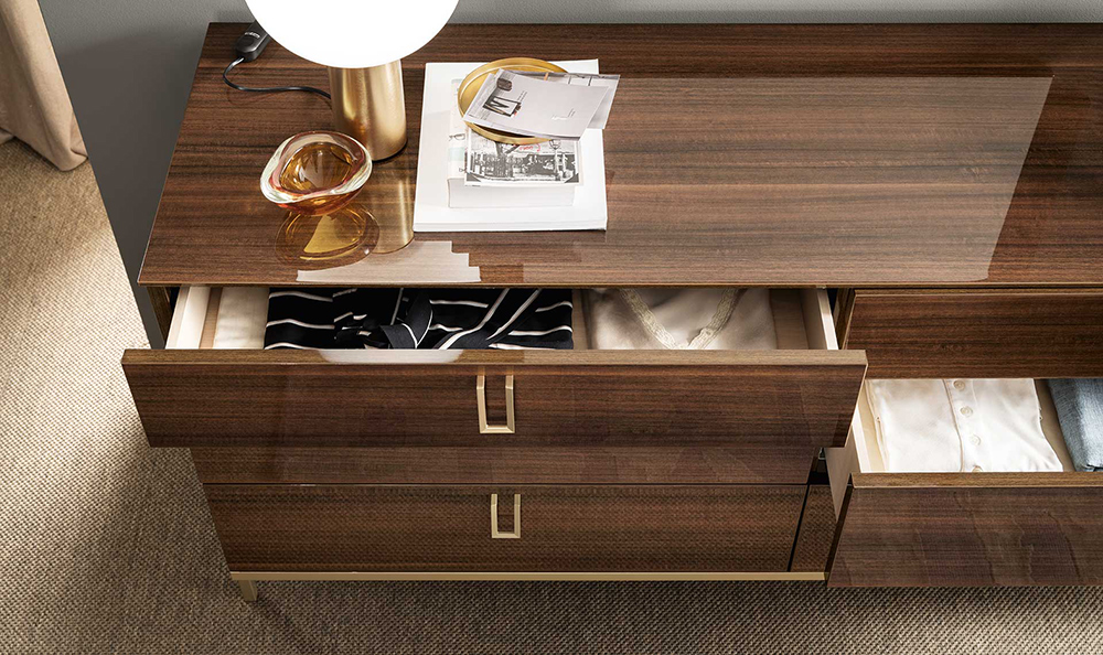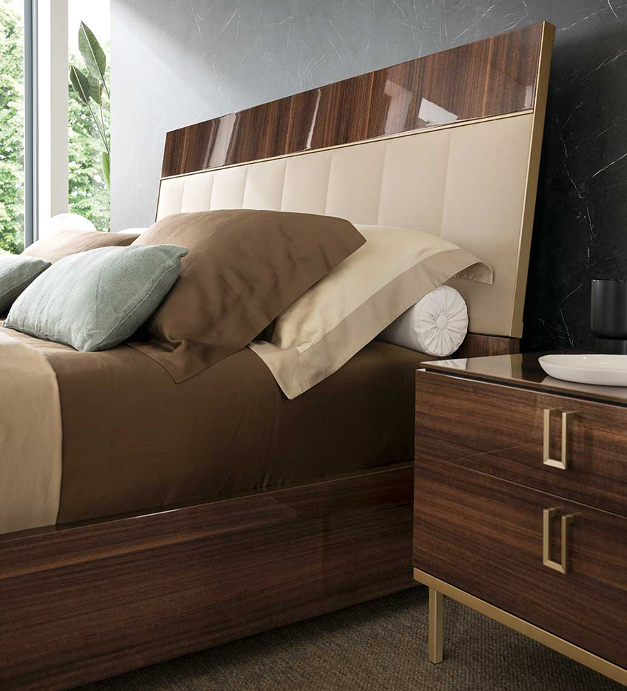 Mid Century Bedroom is made in brown walnut High Gloss lacquer with a perfectly matching golden finish used for the metal parts.