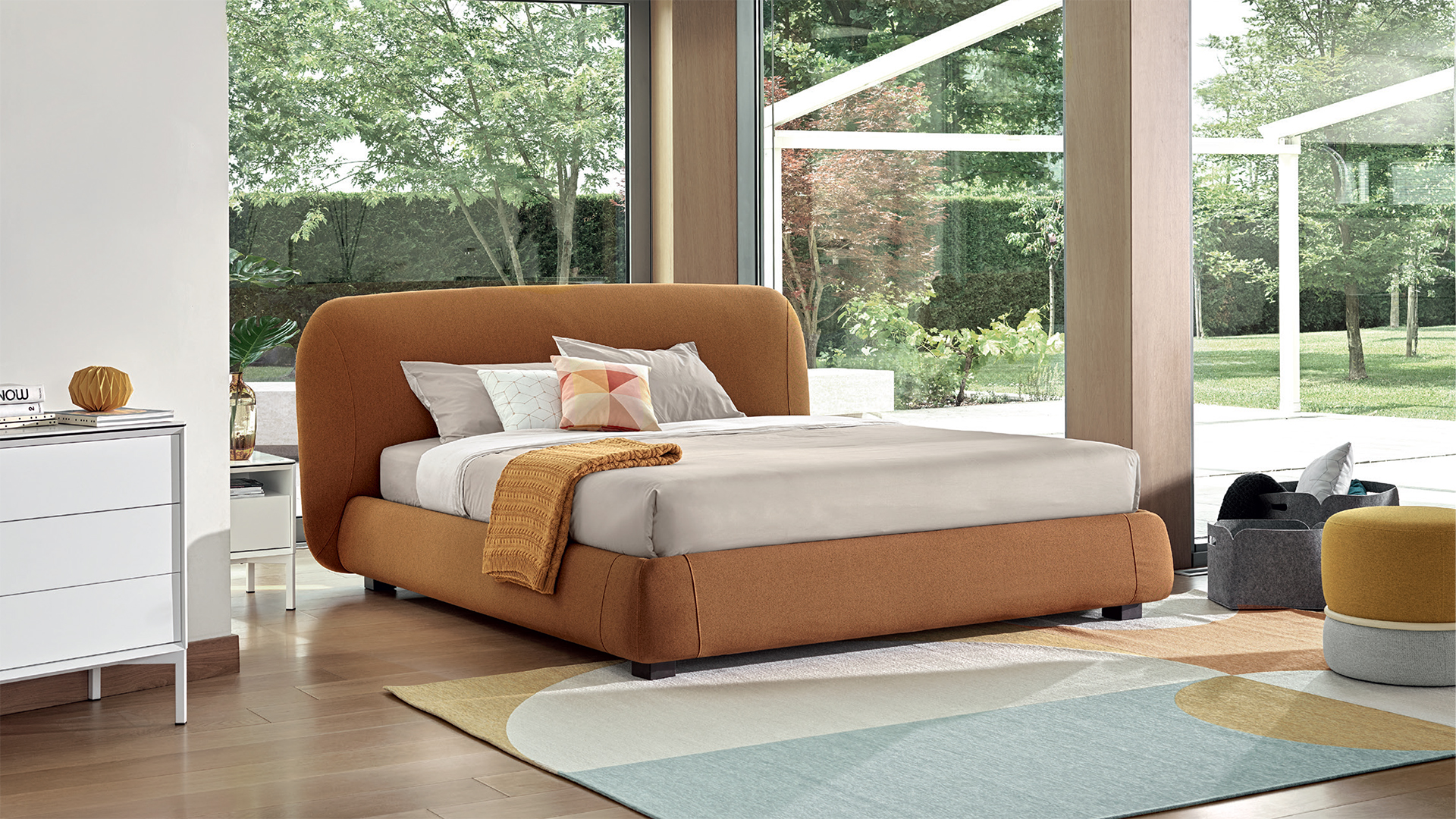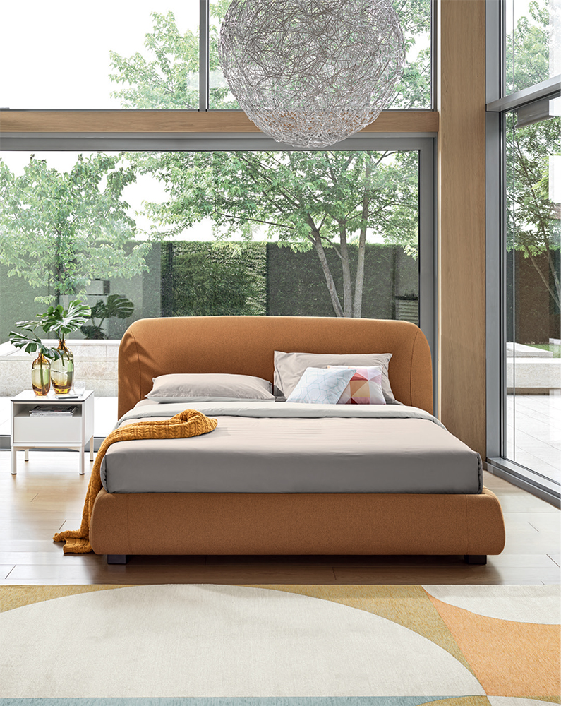 Noa is a sculptured bed with a harmoniously rational structure drawing inspiration from rocks sculpted by the wind. Soft and voluminous, the simple-looking headboard has a three-dimensional beauty which is accentuated further by the topstitching on the curved surfaces. The item is available with three versions of the feet in wood or one version of the feet in metal with the option of choosing a look and height from the ground that suits the customer best. Noa is available with a fixed bed base or container unit. Can be upholstered in fabric or leather.